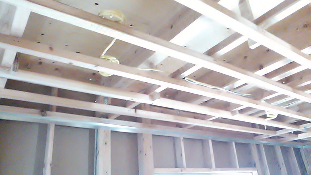 早良区野芥 K様邸の幸せづくり状況です~♪   吹き付け断熱工事が完了しました!   断熱材の上からプラスターボードを貼っています!   天井には杉板張りが施されています!   内...