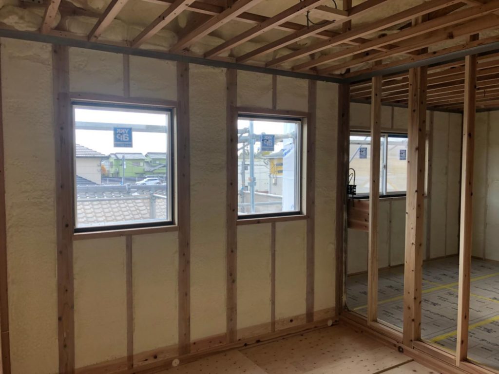 久留米市M様邸の幸せづくり状況です! 吹付断熱工事完了です♪ 夏涼しく、冬暖かい」そんな快適に暮らせる住宅をつくるには、断熱性能を高めることが不可欠です! 木造住宅では床・壁・天井などに断熱材を入れることによって、屋外の...