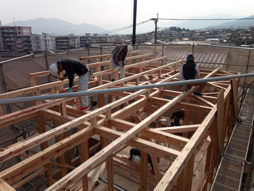 こんにちは、福岡の注文住宅セイケンハウスです~♪ 福岡市西区拾六町にて、T様邸の棟上げ工事が行われました! 棟上げは、基礎工事が終わった後に行われます♪ 一階の柱を立てるところから始まり、その上に梁を架け、...