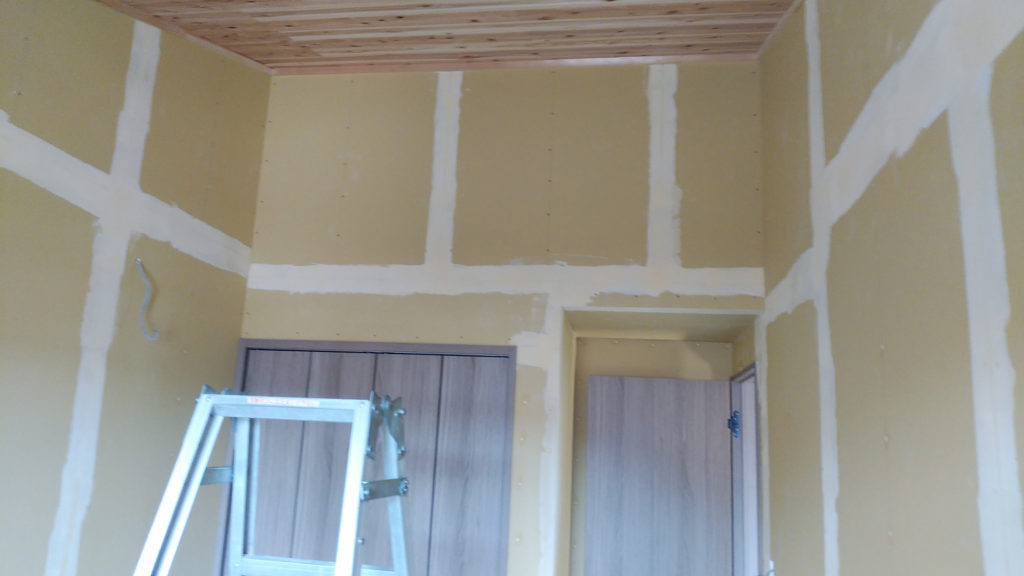 宗像市K様邸の幸せづくり状況です! 木工事中です♪ 貼り終わったボードの上にパテで均して、クロスの下地を造ります! 次の工程に進みます♪   ★福岡の新築・一戸建て・注文住宅★ 〒812-0851 福岡県福岡市...