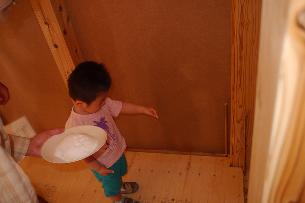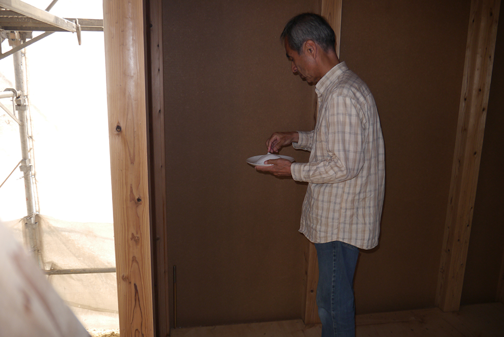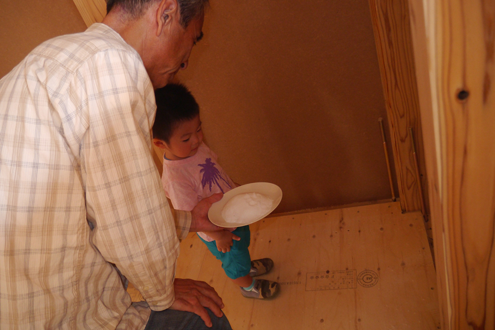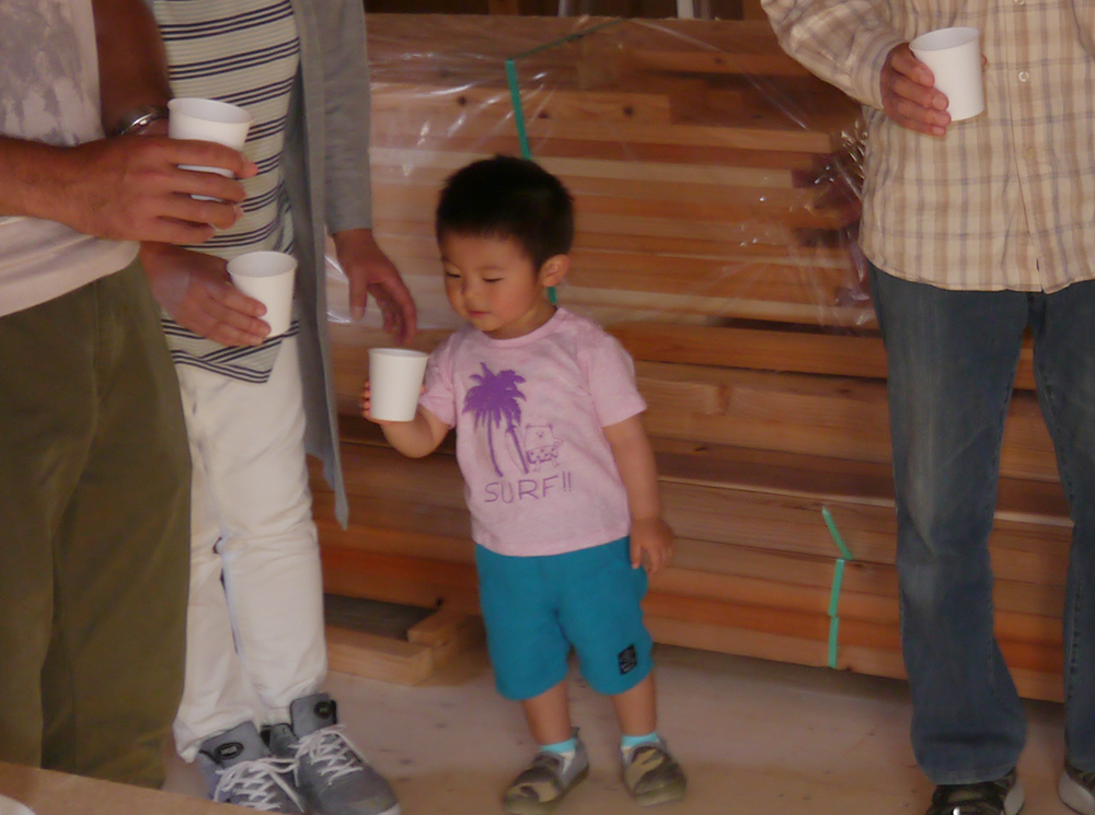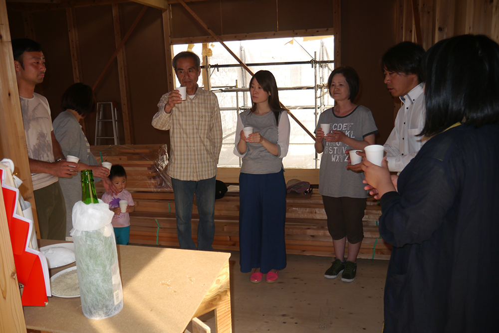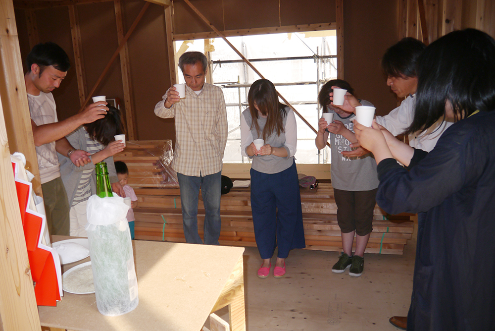 無事に棟上げ工事が終わったことへの感謝の気持ちと、これからの工事の無事安全を祈念して、建物の四隅の柱を酒、米、塩でお清めします(^^)