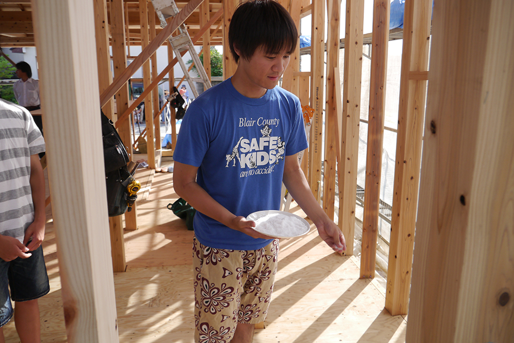 また、四隅の柱に酒、塩、米、をまき、天地四方の神を拝む四方祓いをおこなっていただきます<(_ _)>