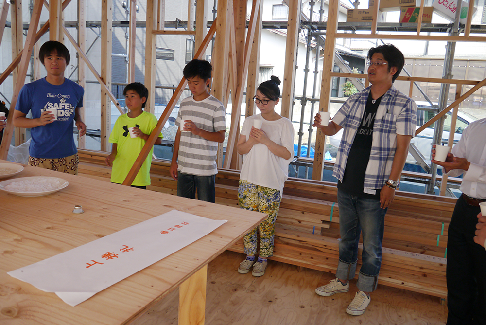 上棟のおめでたい席なので、『おめでとうございます』のご唱和で!!
