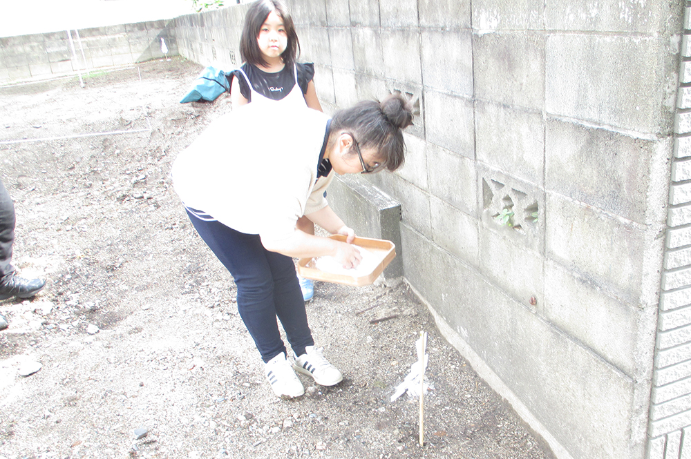 鎌で土地の草を刈り、鍬で土地を均し、最後に杭打ちで基礎固めをする!