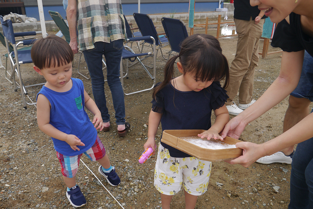 そしてすべての四隅を終えたら 残ったお塩を土地全体に撒いていきます!
