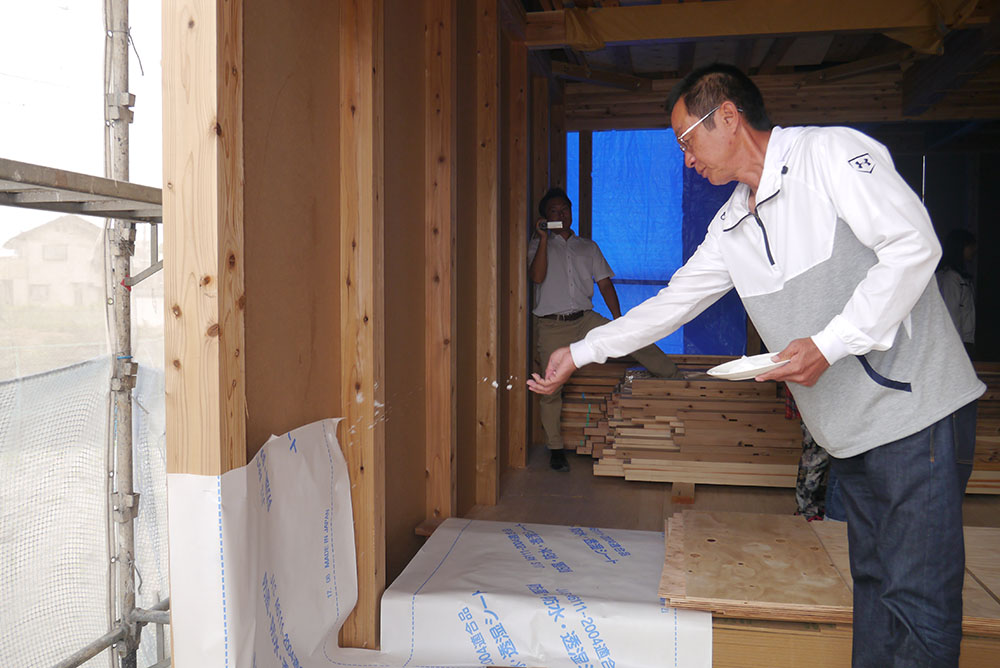 四方祓いとは、これからの工事を安全に行えるよう、四方の柱に酒、米、塩を撒いて清める行為です!