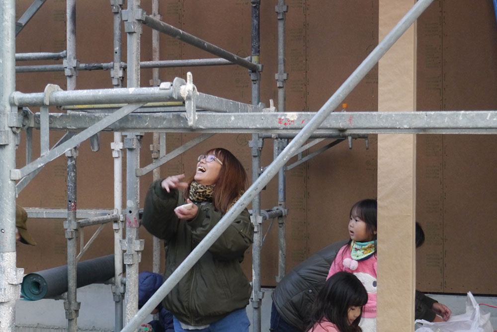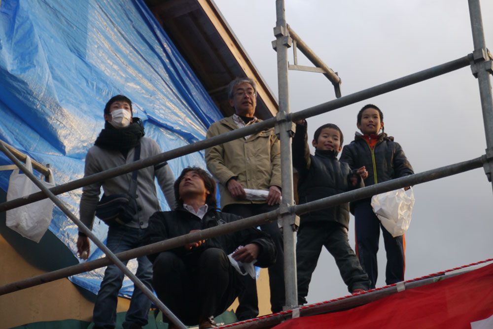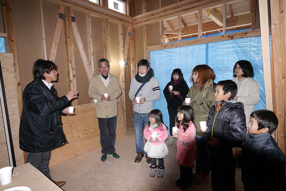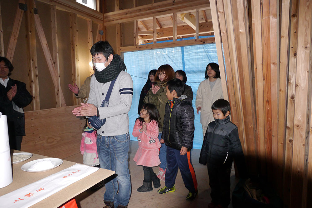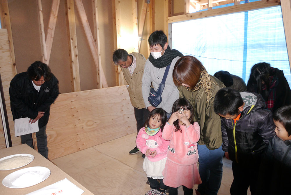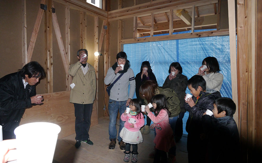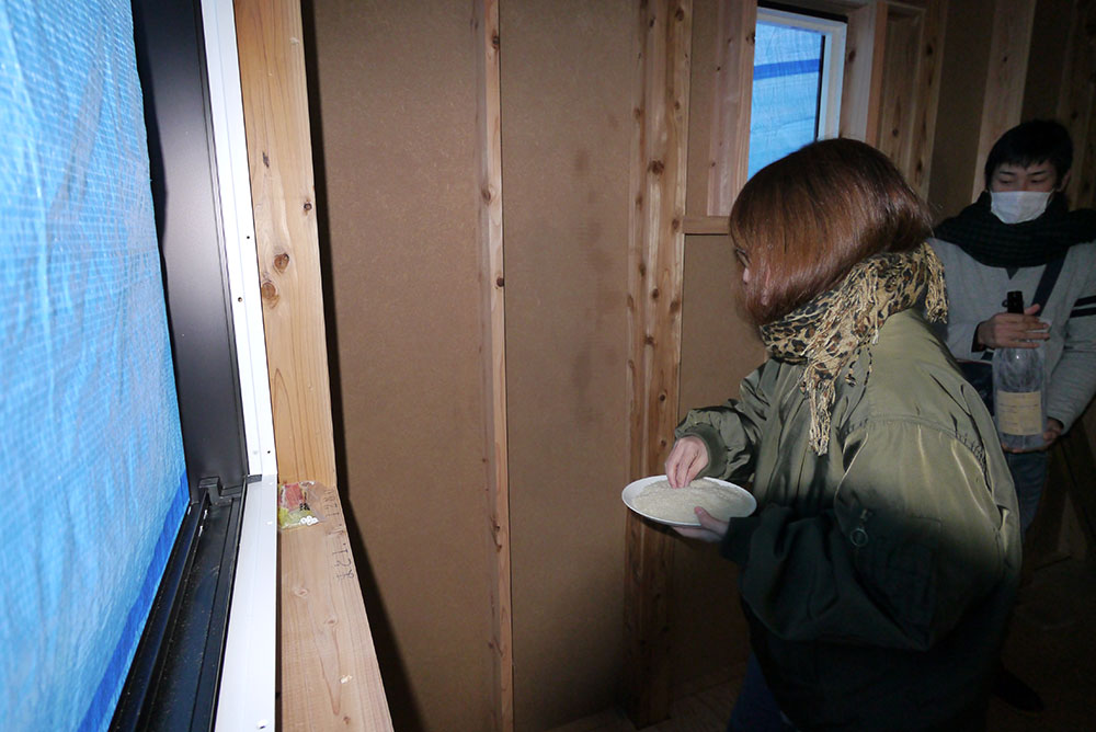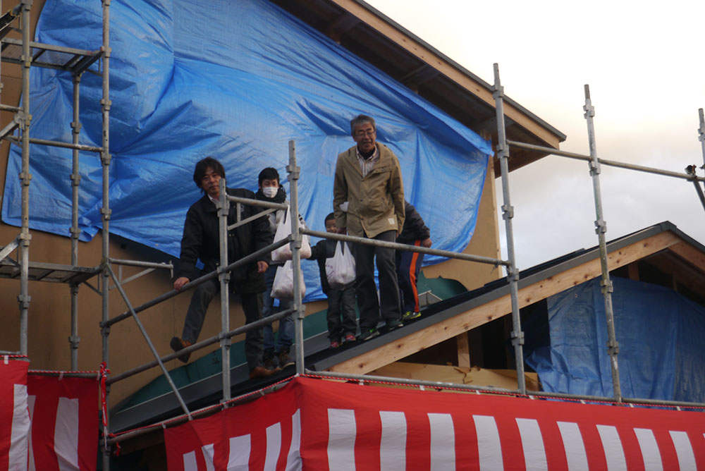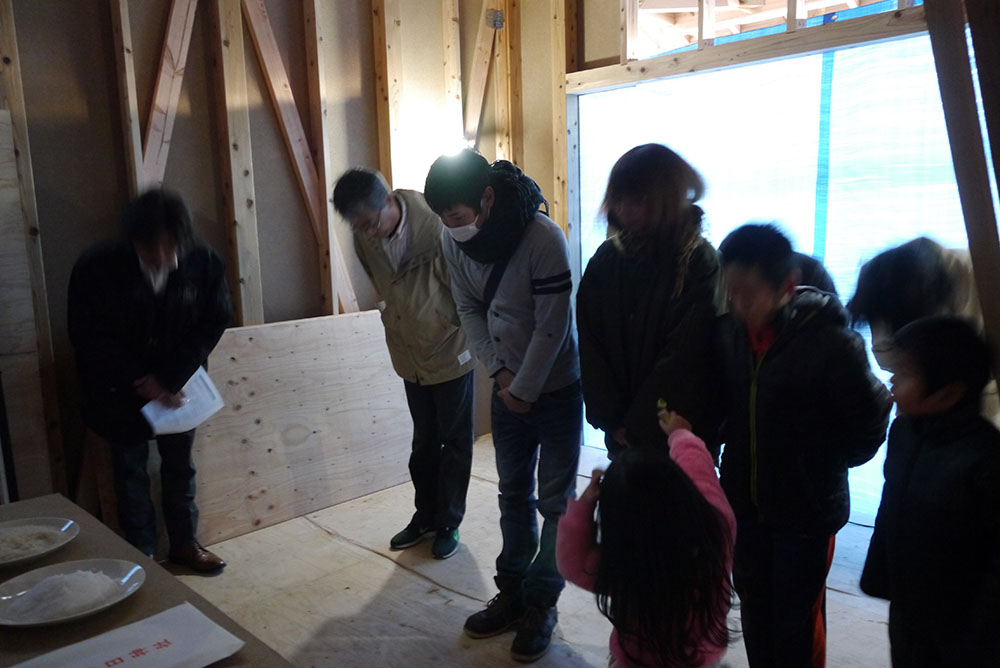 続いて、建物の四方に酒、塩、米を撒いて清める、上棟の儀を行います!