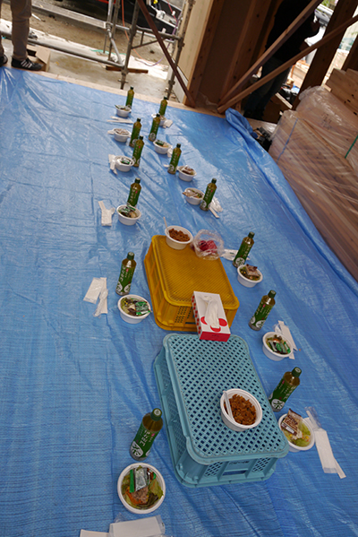 屋根小屋組みの最も高い所に納める水平材を棟木といい、棟木を納めると棟上げ完了となります(*^_^*)