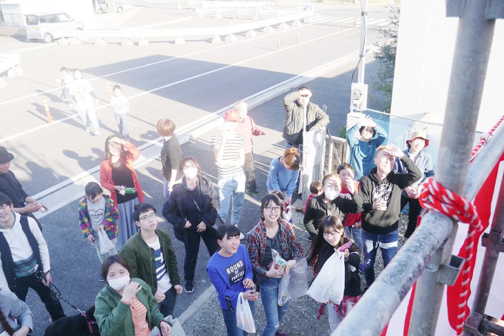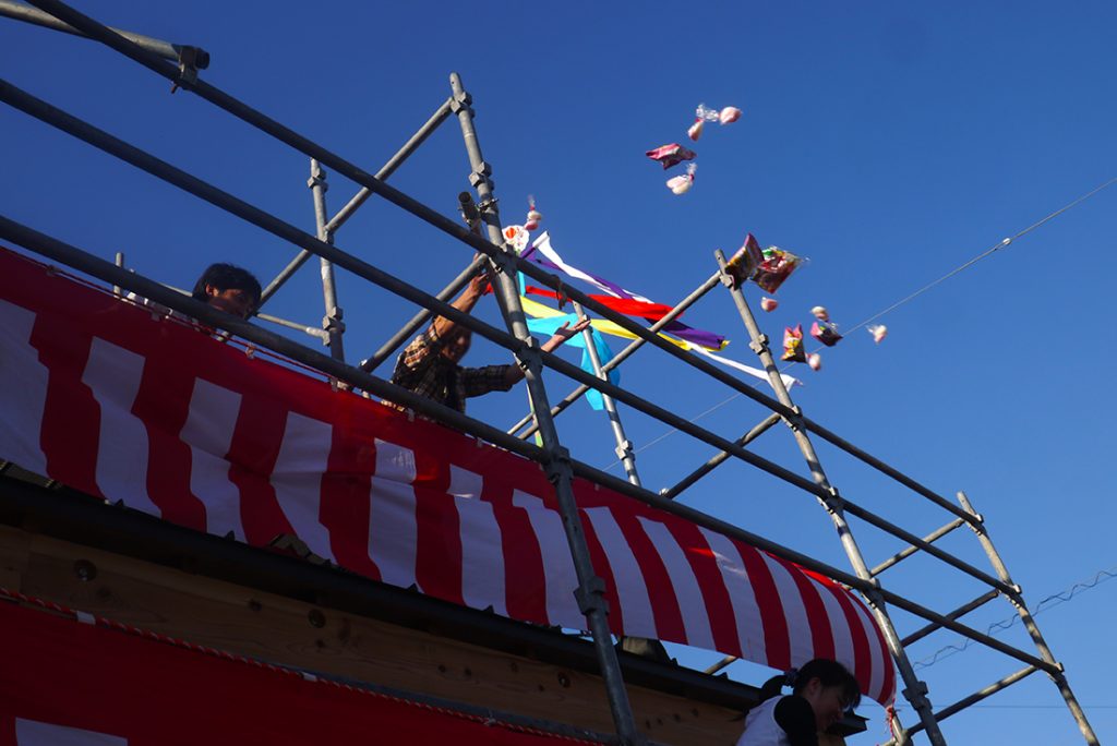 たくさんのお餅が宙を舞い、K様と餅まきに集まっていただいた皆様との心をつないでいます(^^♪