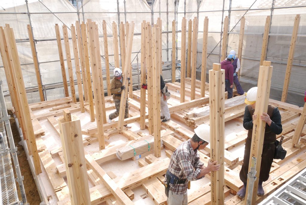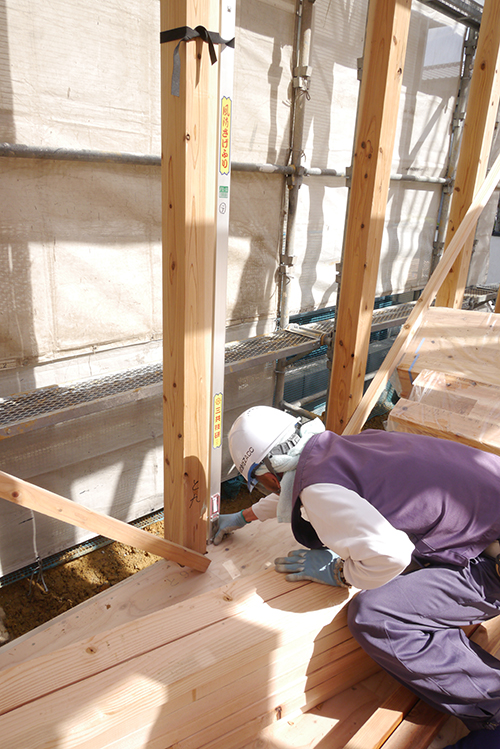 従来の木造軸組み工法に加え、土台・柱・横架材に構造用ハイベストウッドを貼りつけ、全体を一つの箱にしています!