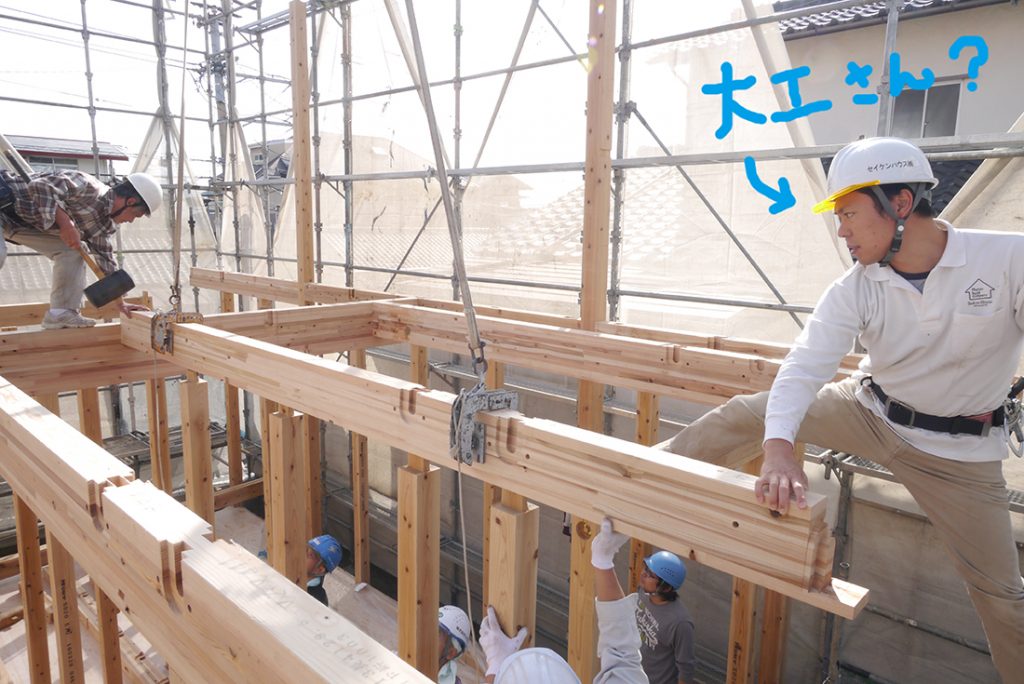 次々に柱を立てて梁を打ち込み、平面上の図面の上にあったお家は立体的に組み上げられていきます(*’▽’)