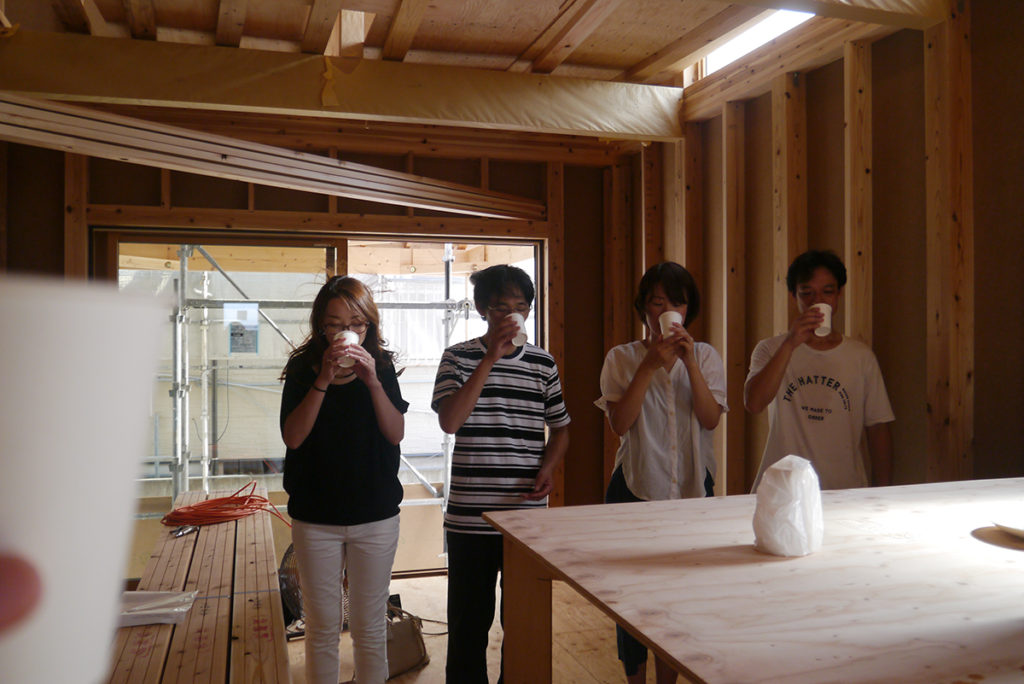 上棟のおめでたい席なので、『おめでとうございます』のご唱和で!