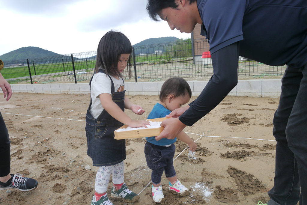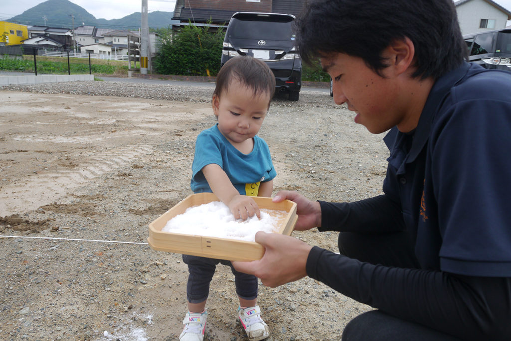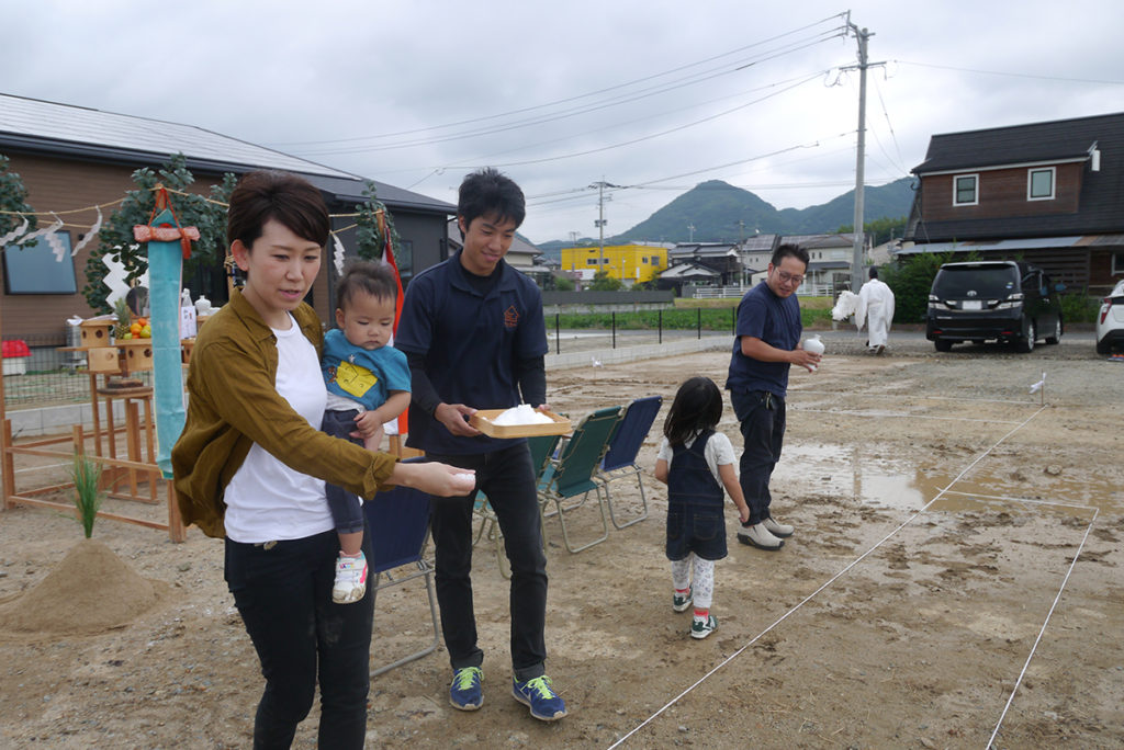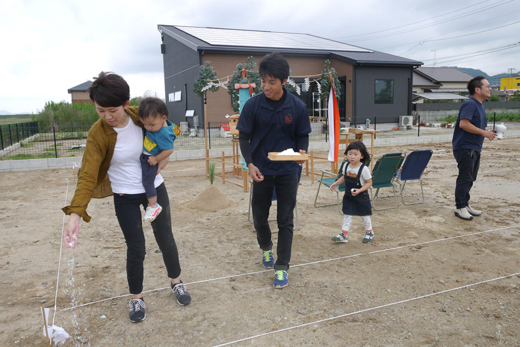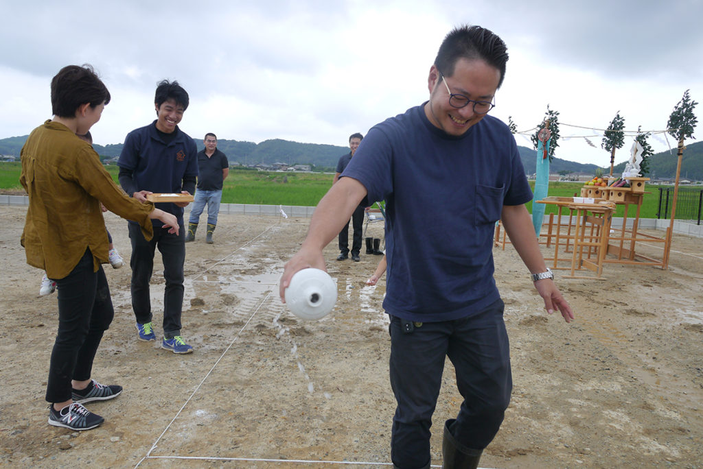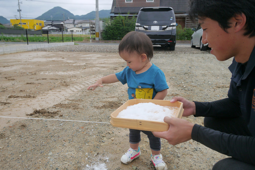敷地の四隅と中央などに、お神酒、お塩を撒いて土地の平安を祈念して、祓い清めます(/・ω・)/