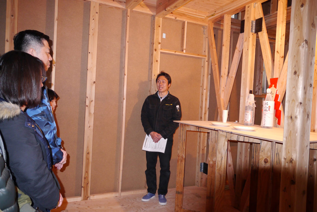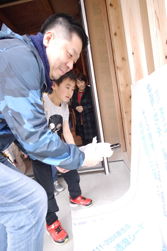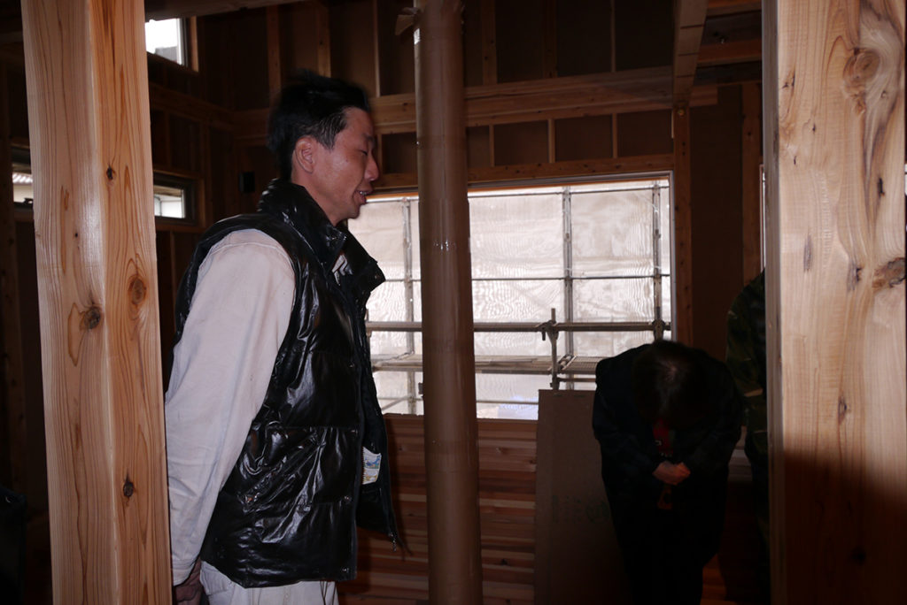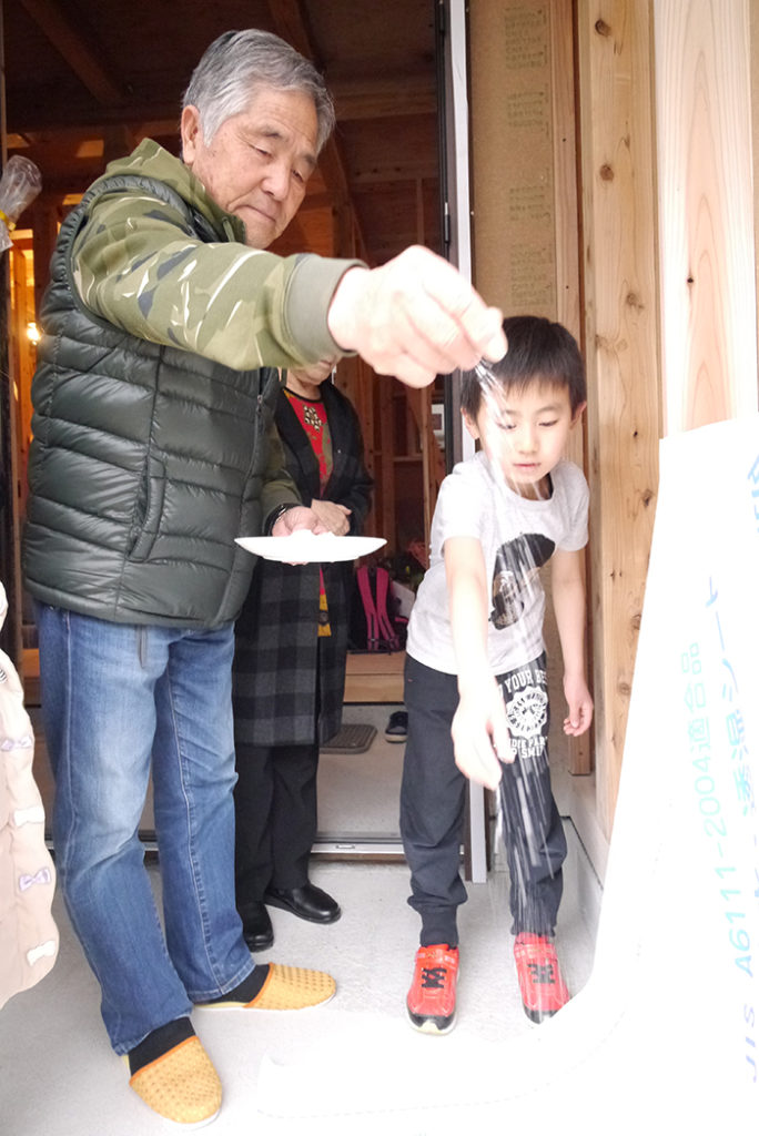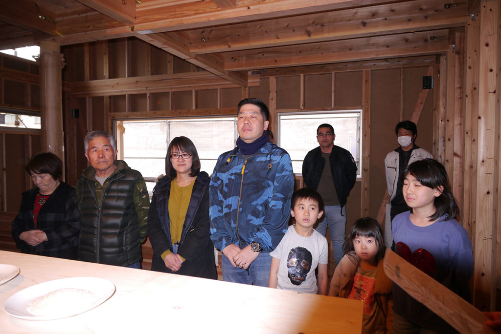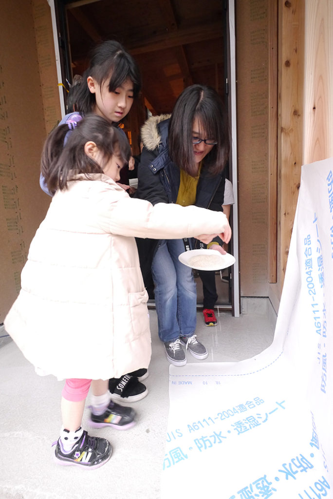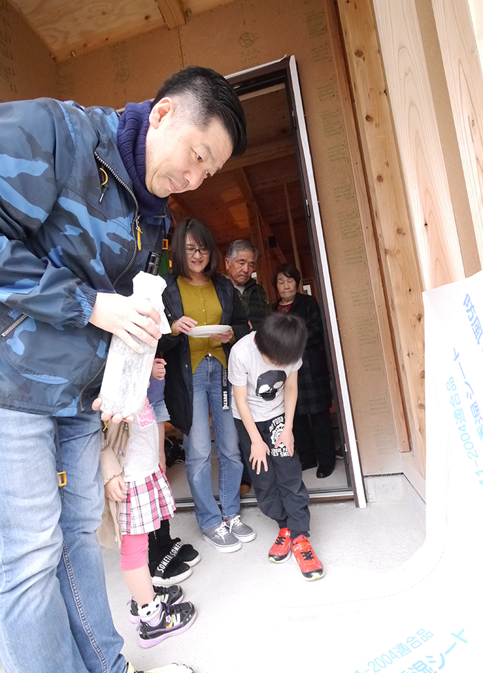 四方祓いでは、施主様が建物の四隅に酒、塩、米を撒いて、今後の工事の安全、無事を祈ります(#^^#)