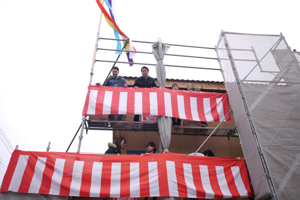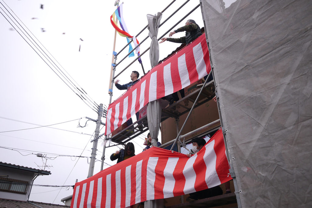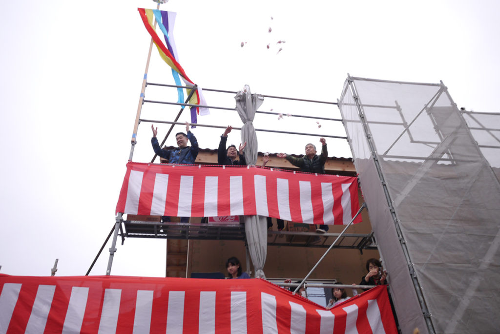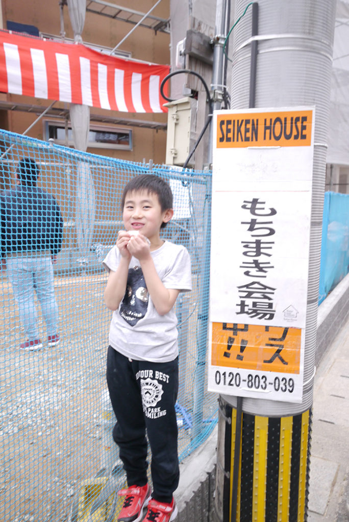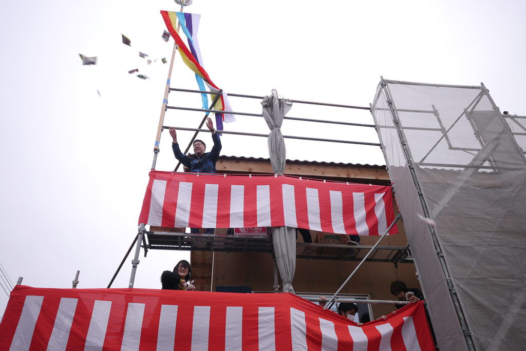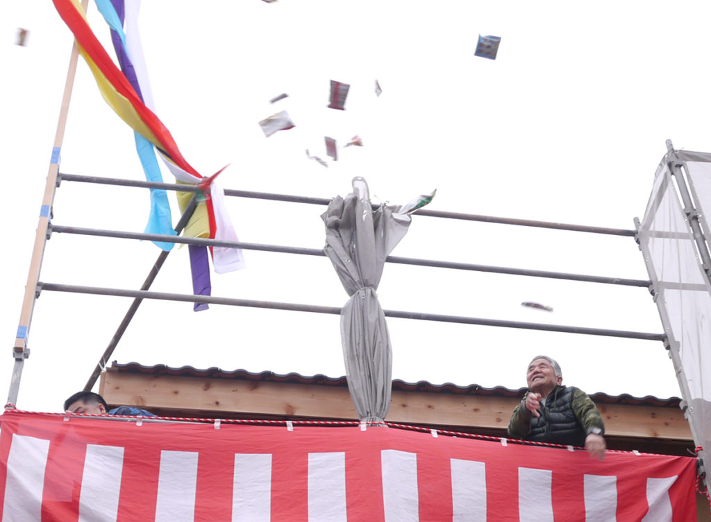 無事に棟上げ工事が終わった後に行われた、上棟式もちまきの様子です(*’▽’)♪