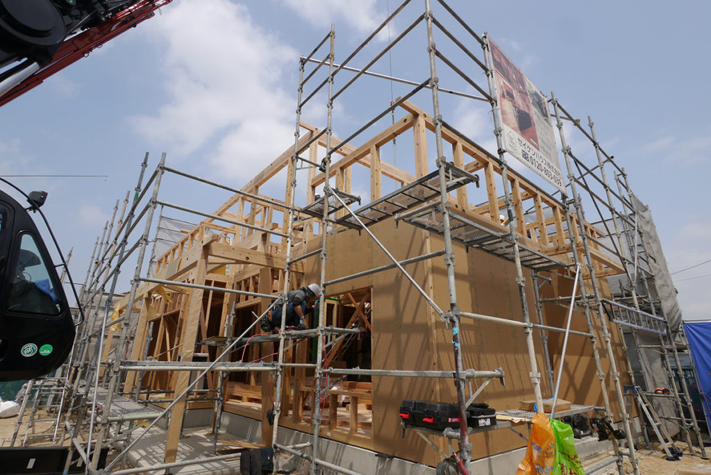 一階部分が出来上がり、耐力面材を貼っていきます!