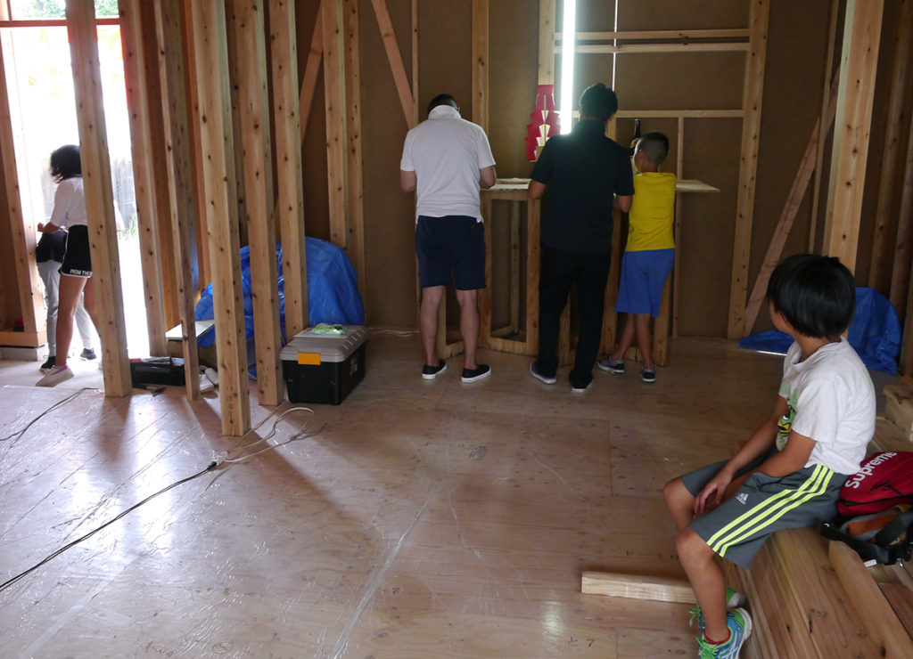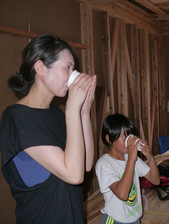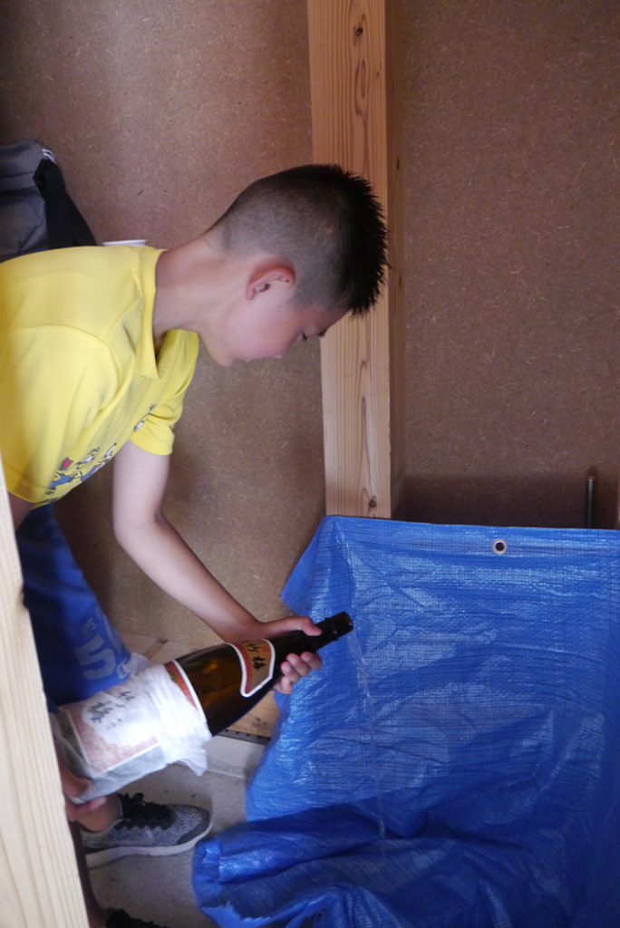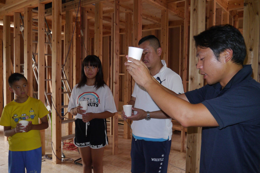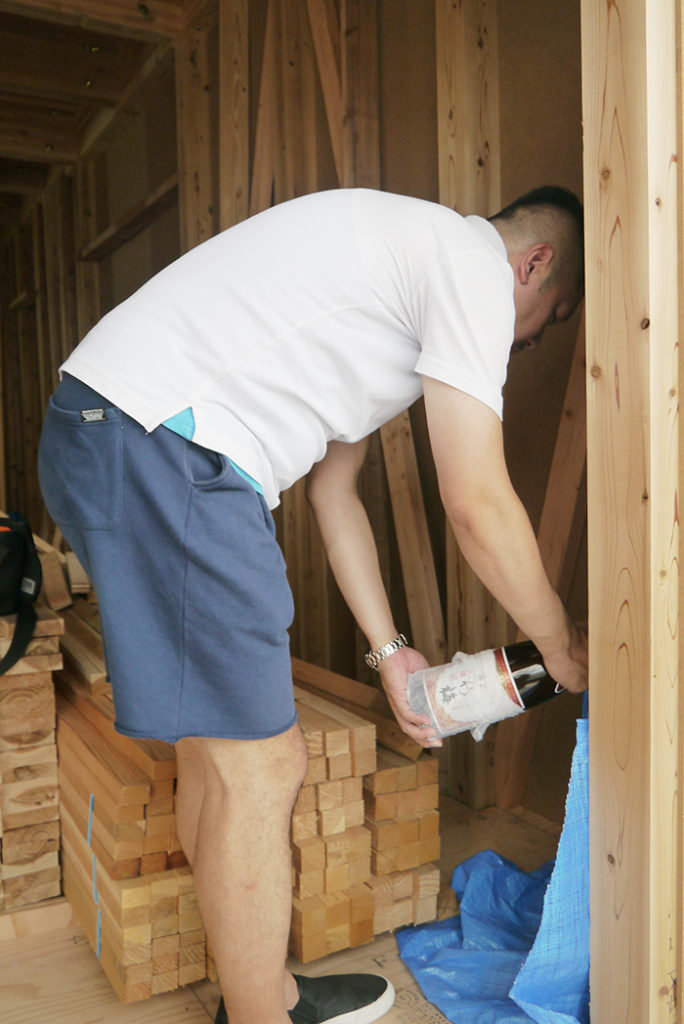 四方祓いでは、施主様が建物の四隅の柱に酒・塩・米を撒いて祓い清め、今後の工事の無事安全を祈念します!