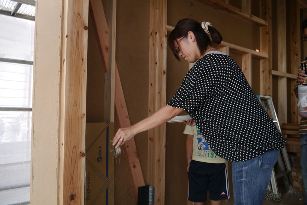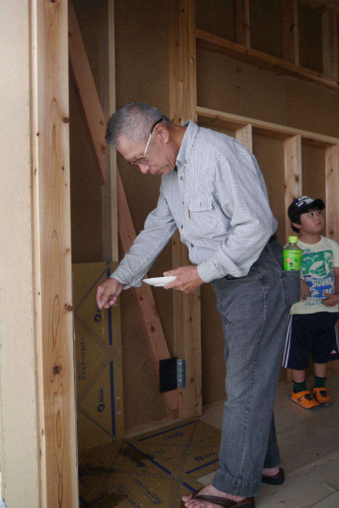 続いて建物の四方に酒、塩、米を撒いて清める上棟の儀(四方祓い)を行いました!
