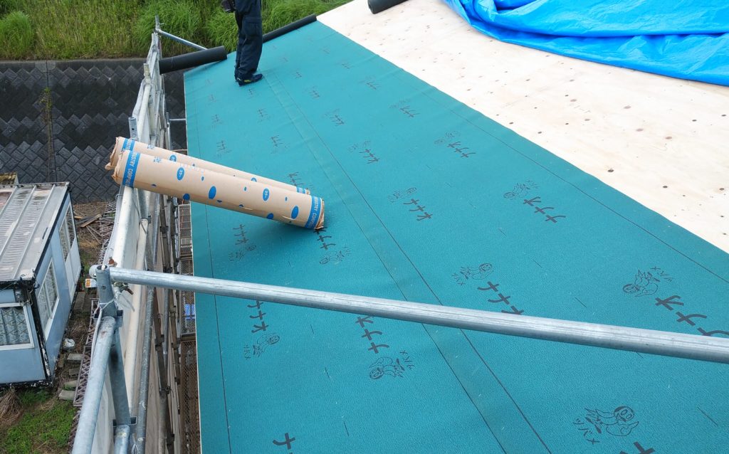 垂木の上に、下地の野地板を貼り、その上に万一の雨に備えて、防水シートを敷いていきます!