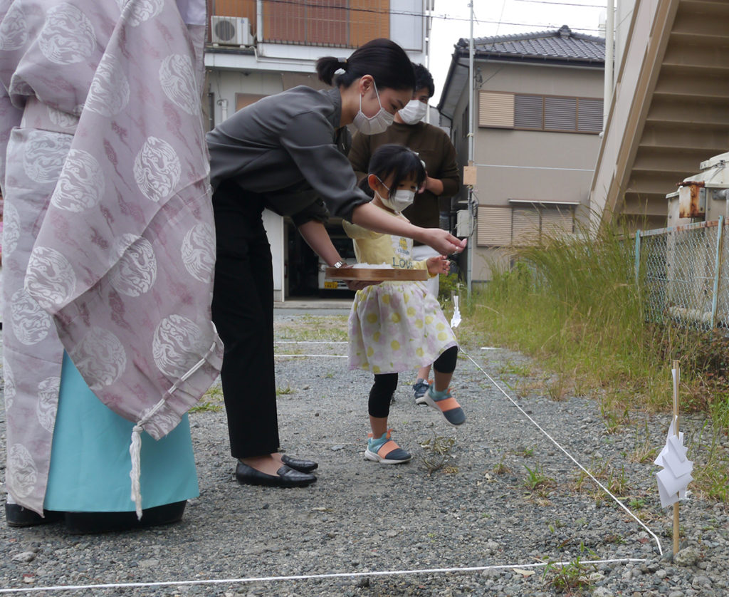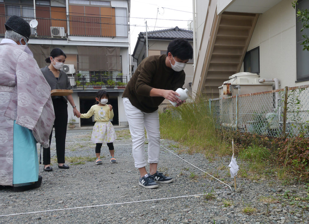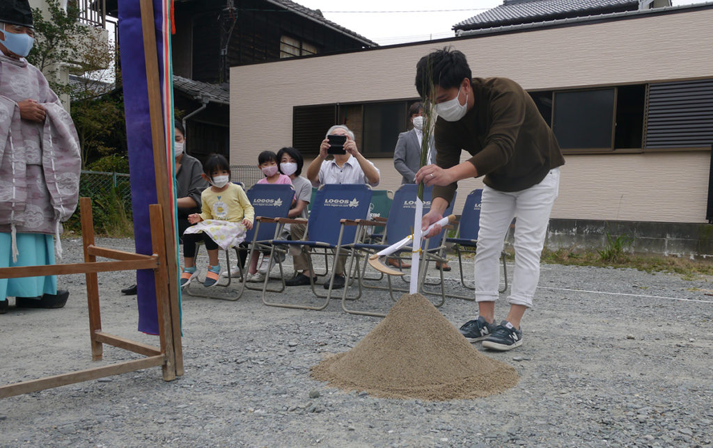 土地の四隅を神主さんが祓い、M様ご家族様は、四隅にお神酒、お塩を撒いて祓い清めます!