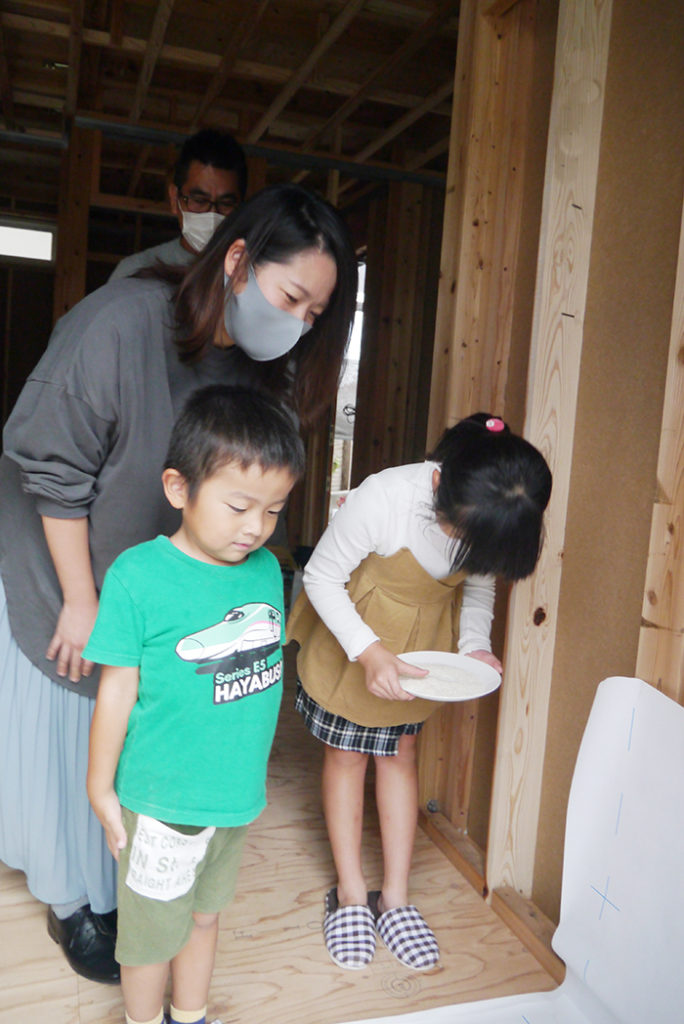 四方の柱にお神酒、お米、お塩を撒いて祓い清め、工事の無事安全を祈念します!