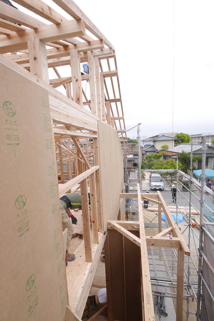二階の柱を立てつつ、構造用の面材を貼っていきます!