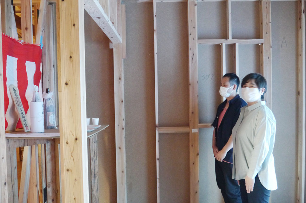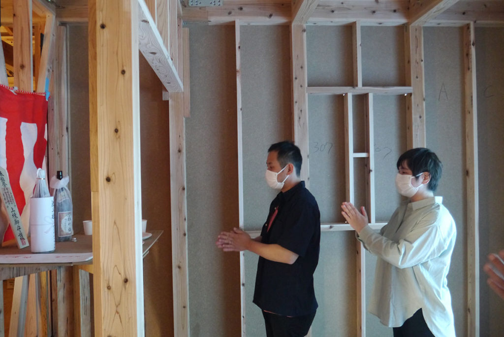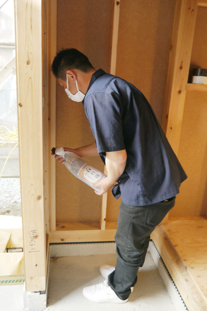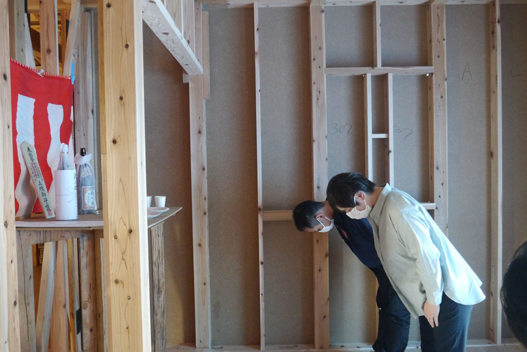 建物の四隅の柱をお神酒、お米、お塩を撒いて祓い清めます!