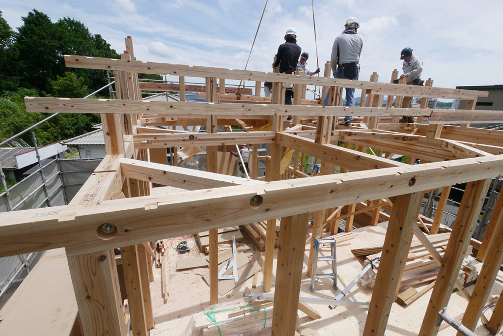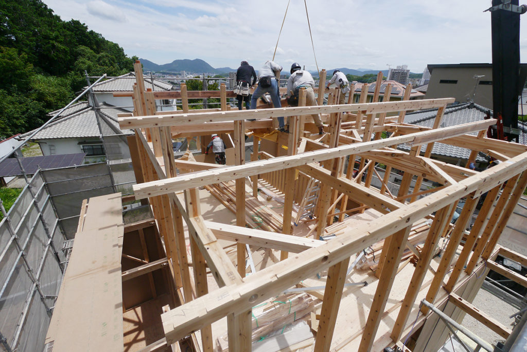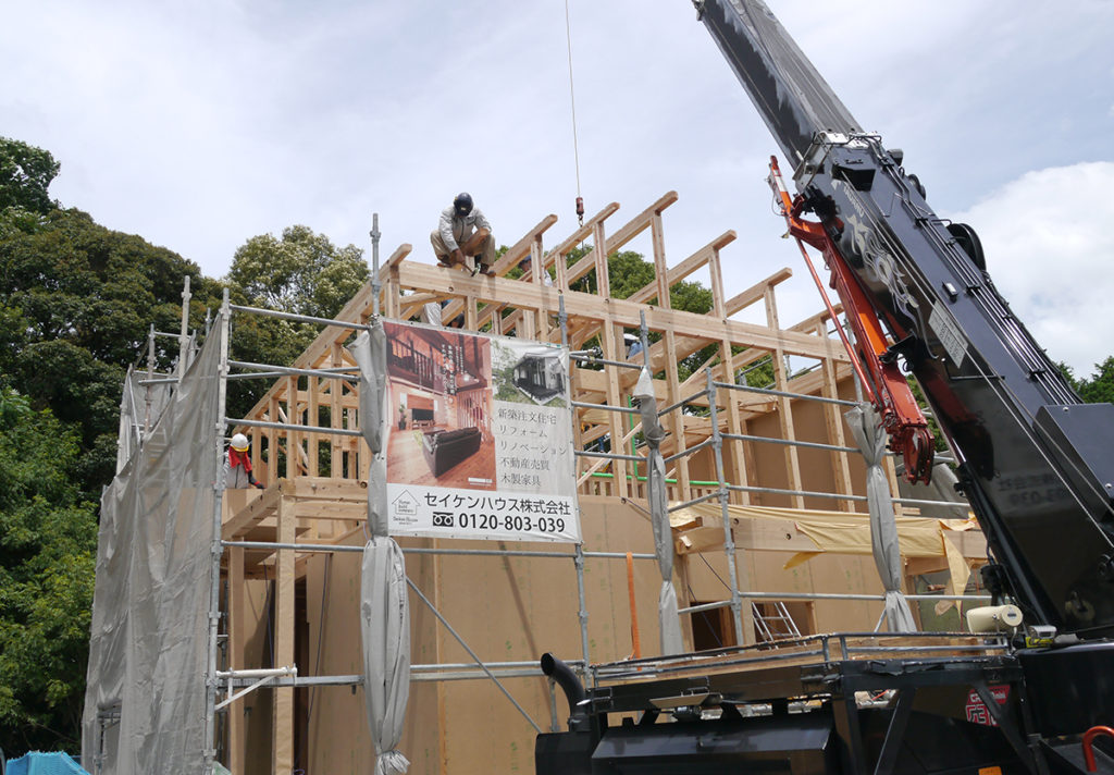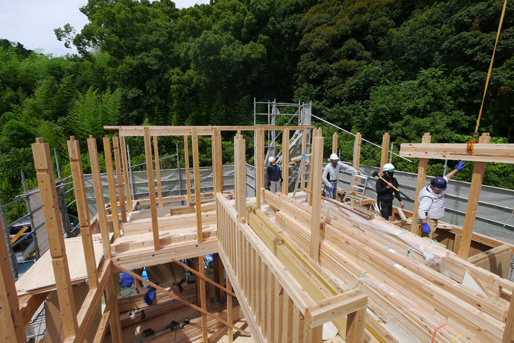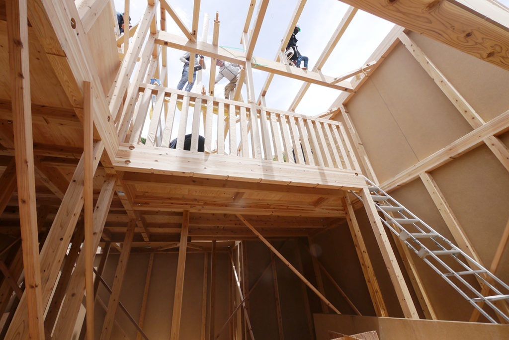 基礎工事が完成した後に木材を使って家の枠組み(骨組み)を組み始め、一番最後に屋根の一番高いところに棟木と呼ばれる横架材を取り付けます!