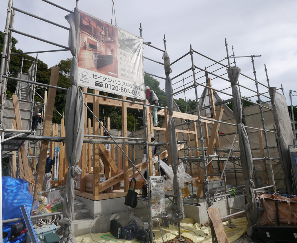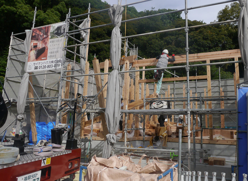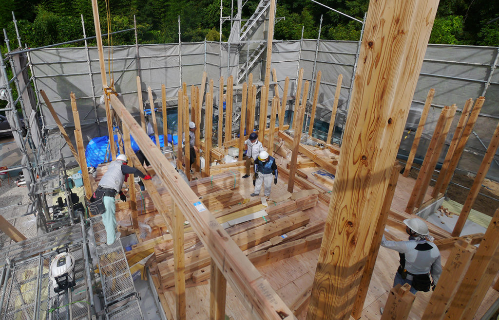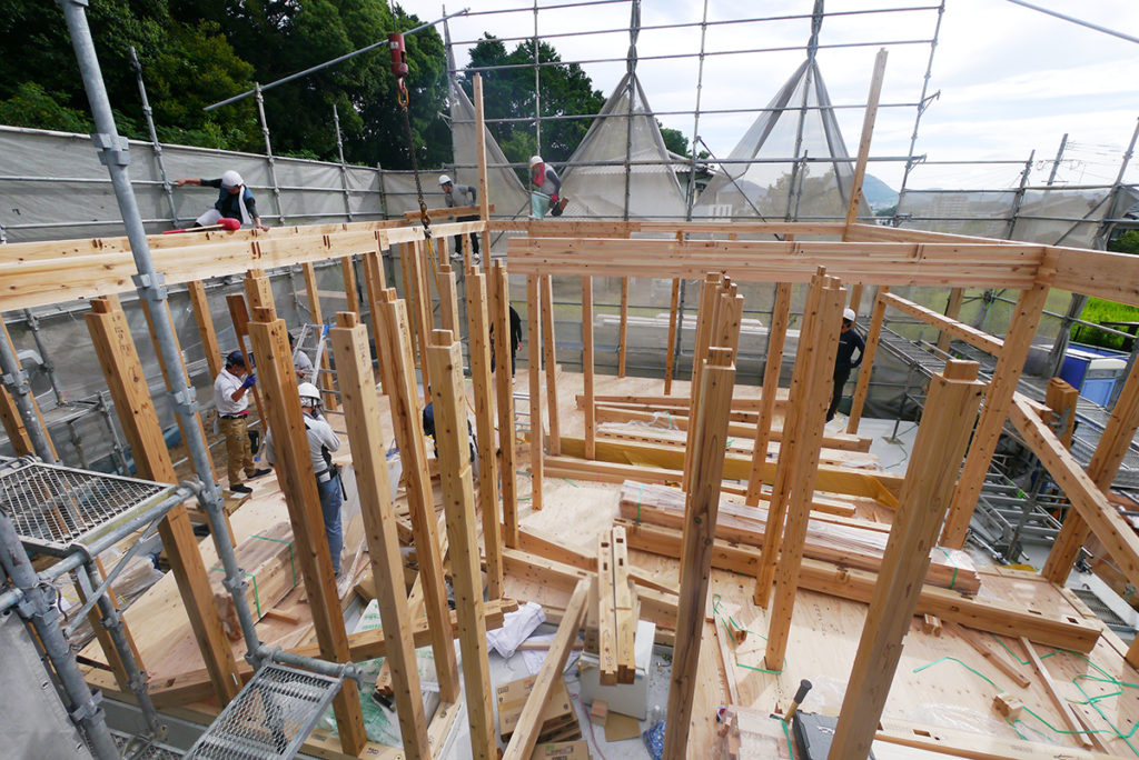 基礎工事が完成した後に木材を使って家の枠組み(骨組み)を組み始め、一番最後に屋根の一番高いところに棟木と呼ばれる横架材を取り付けます!