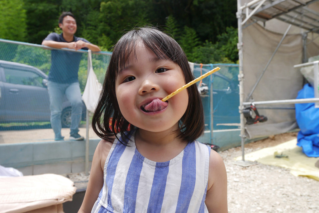 wちゃんは、棟木が上がったところで、スタッフと一緒におやつタイム♪