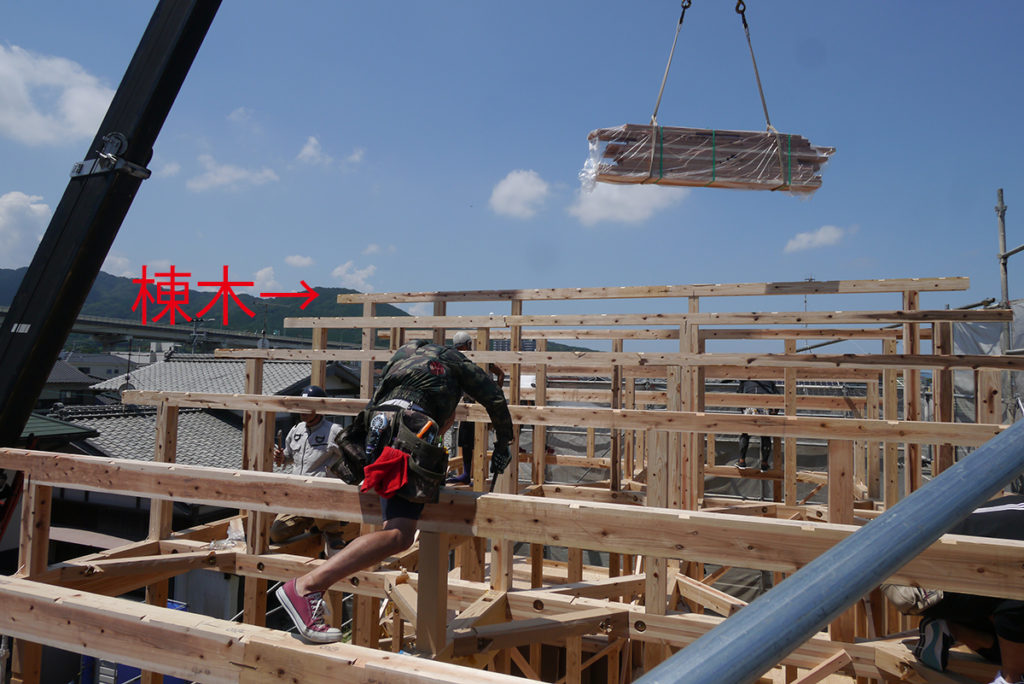 屋根の一番高い部分に用いる横架材を「棟木」と言い、この棟木を設置することを「上棟」と言います!