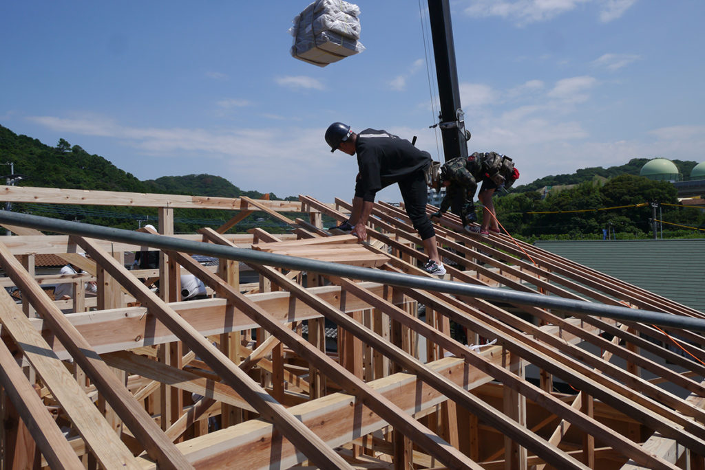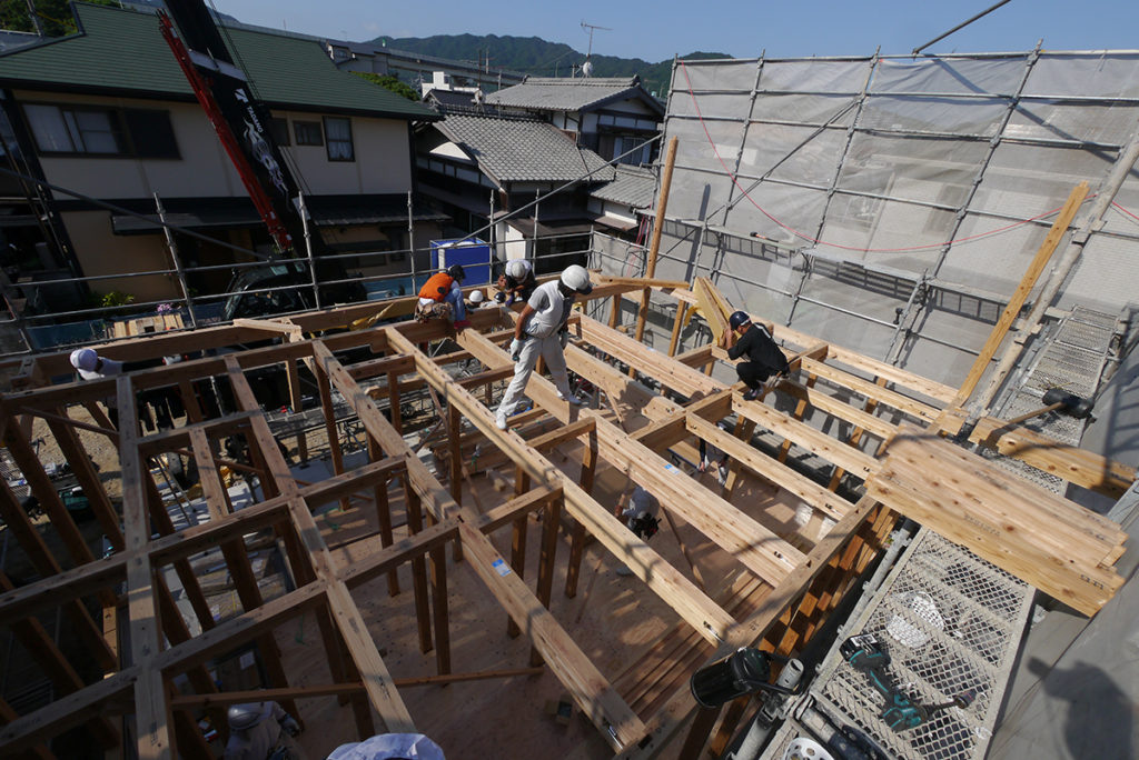 2階の天井梁の施工が終わると、屋根の骨組みである小屋組みに進みます!