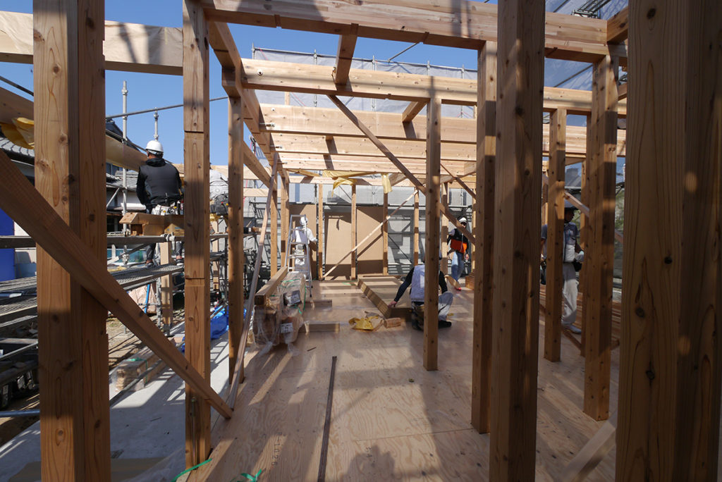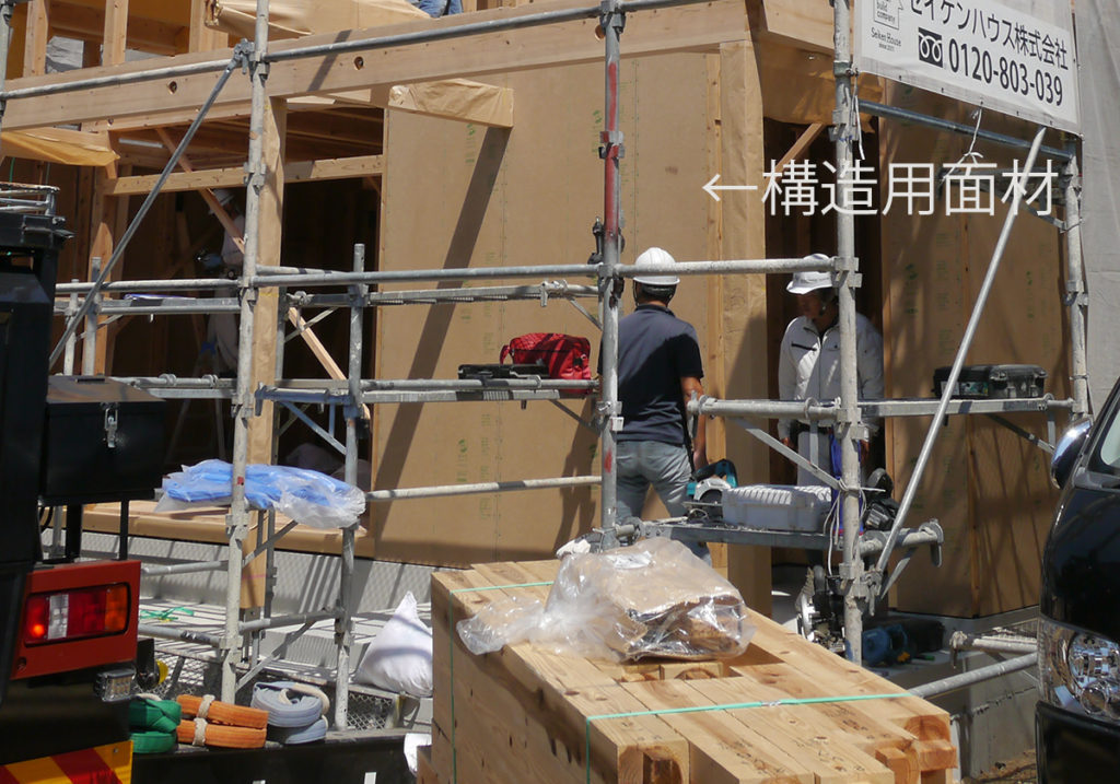 柱、梁、横架材を一体化し、一つの箱にしていくために、壁の下地に構造用面材(ハイベストウッド)を使います!