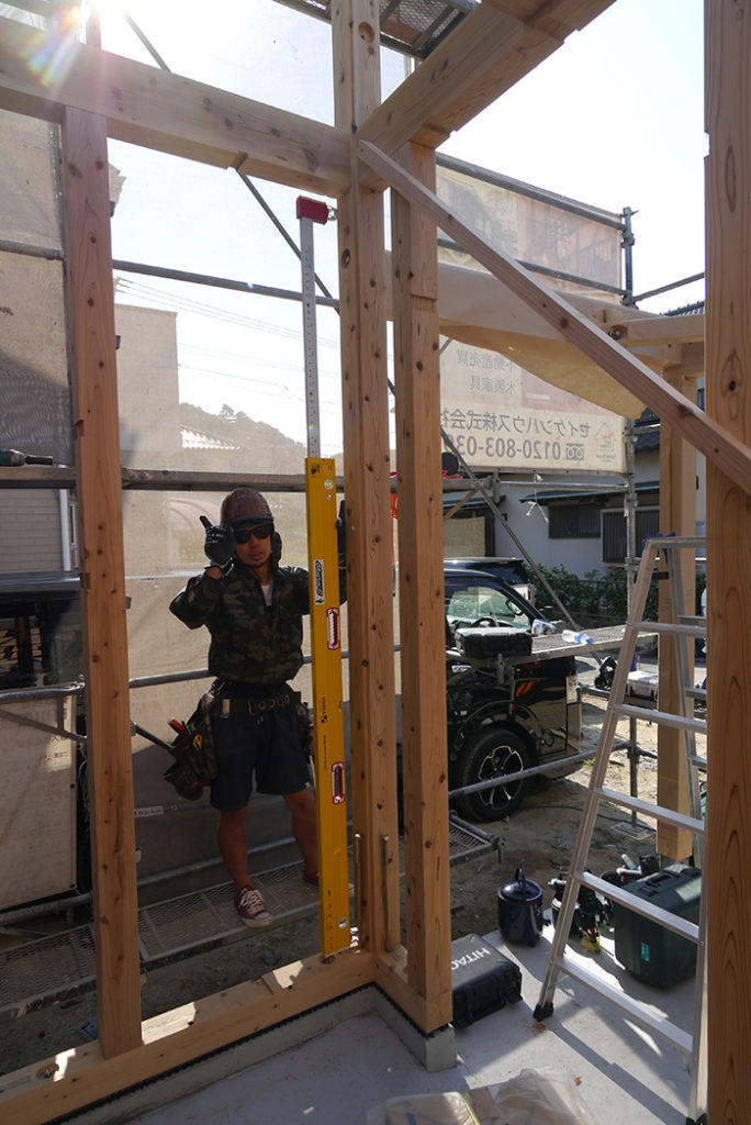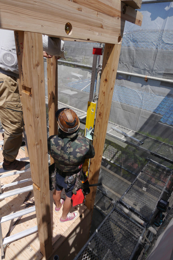 そして、2階でも柱にゆがみがないかの確認と微調整が行われます!