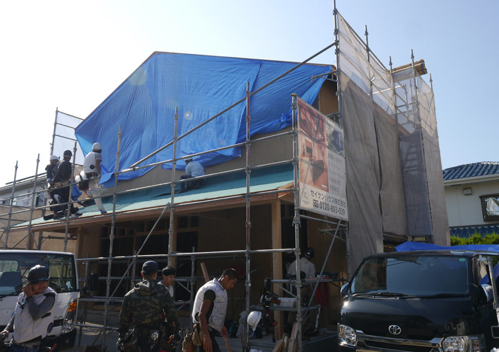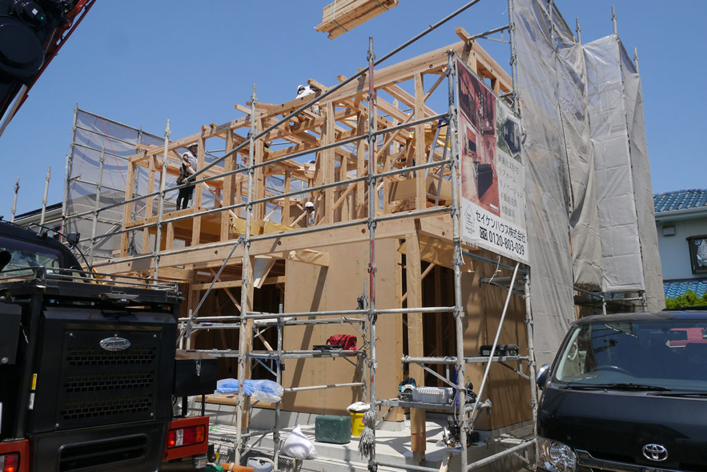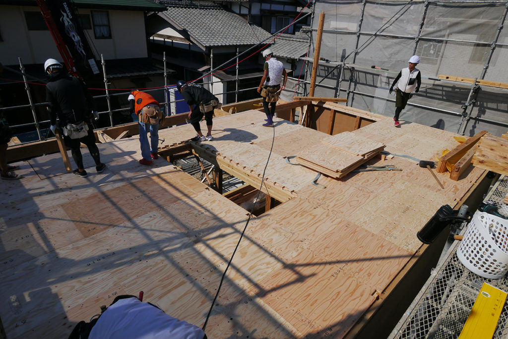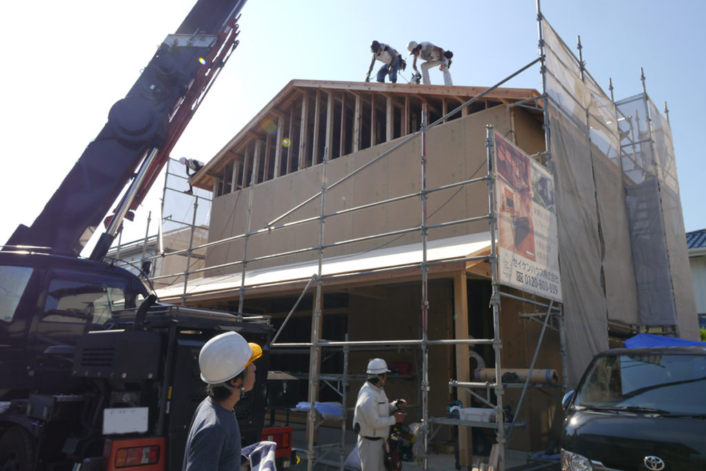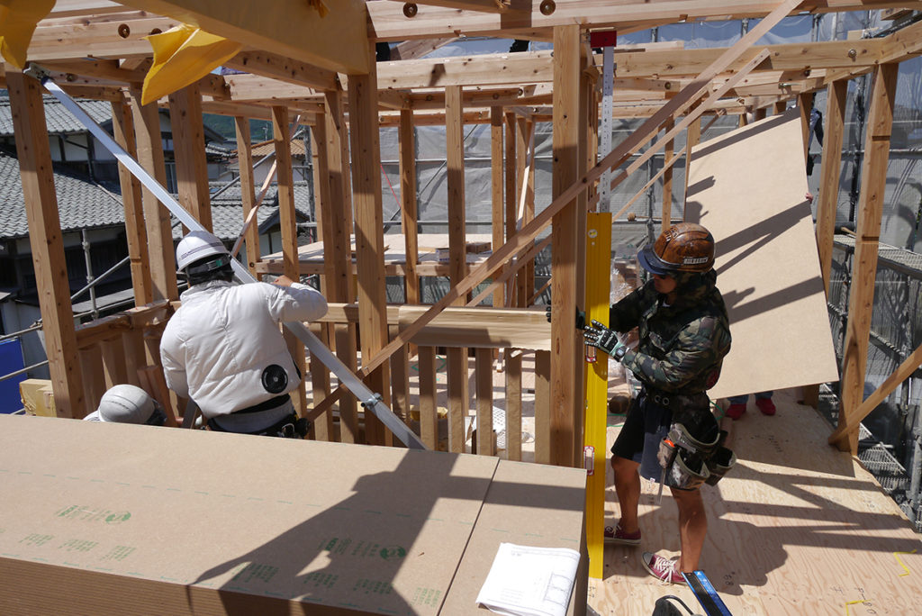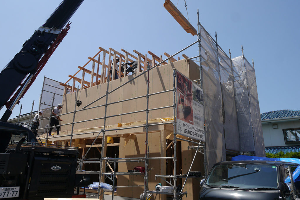 2階まで面材を貼り進み、屋根の工事も進めます(#^^#)