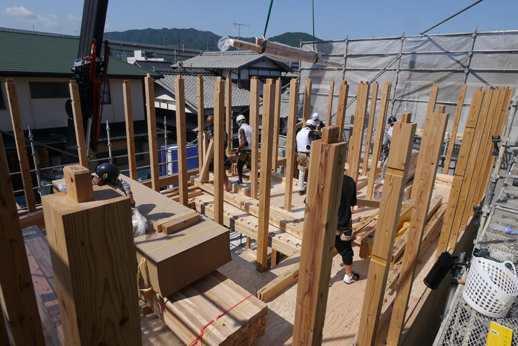 2階の床梁の工程が終わると、次に柱を立てていきます!