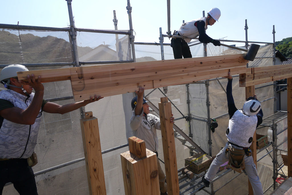 1階の柱を立て終わると、梁を施工します!