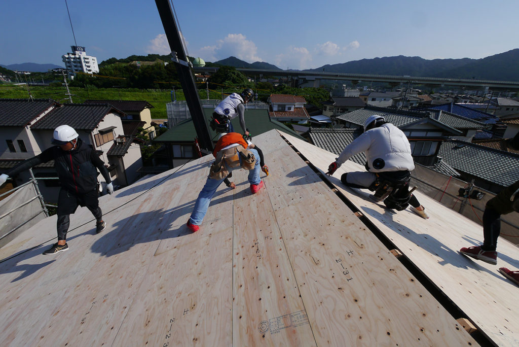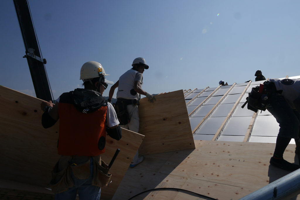 通気スペーサーの上に、屋根の下地の合板を貼ります!