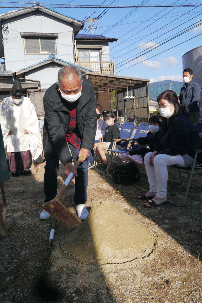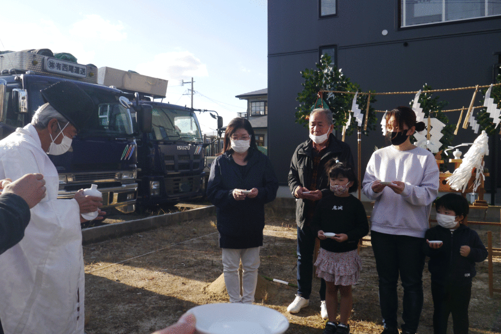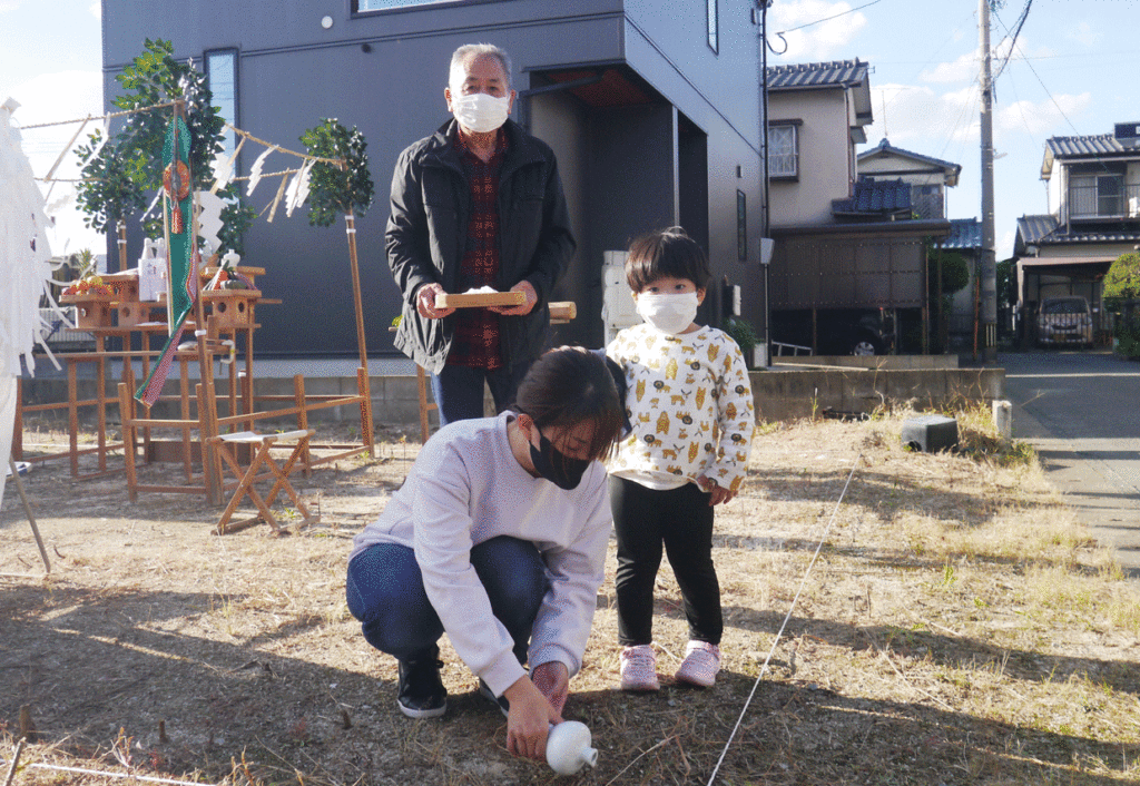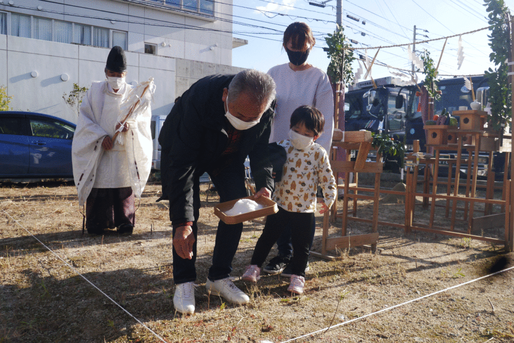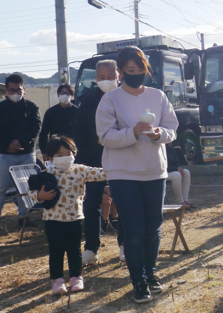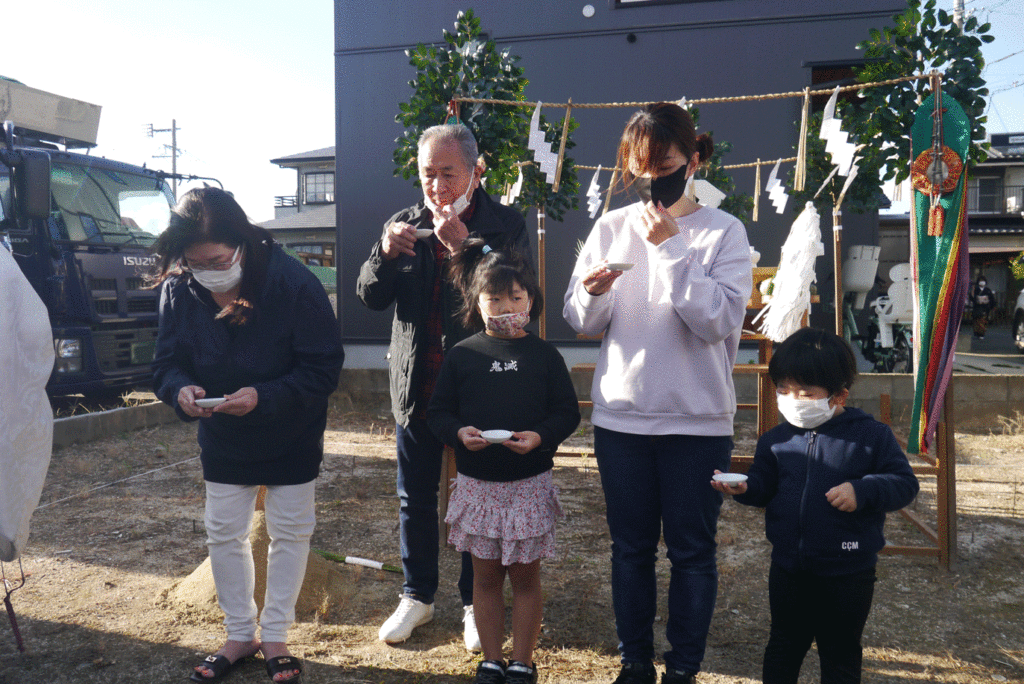 施主様やご家族様が敷地の四隅に酒、塩を撒いて祓い清めます!