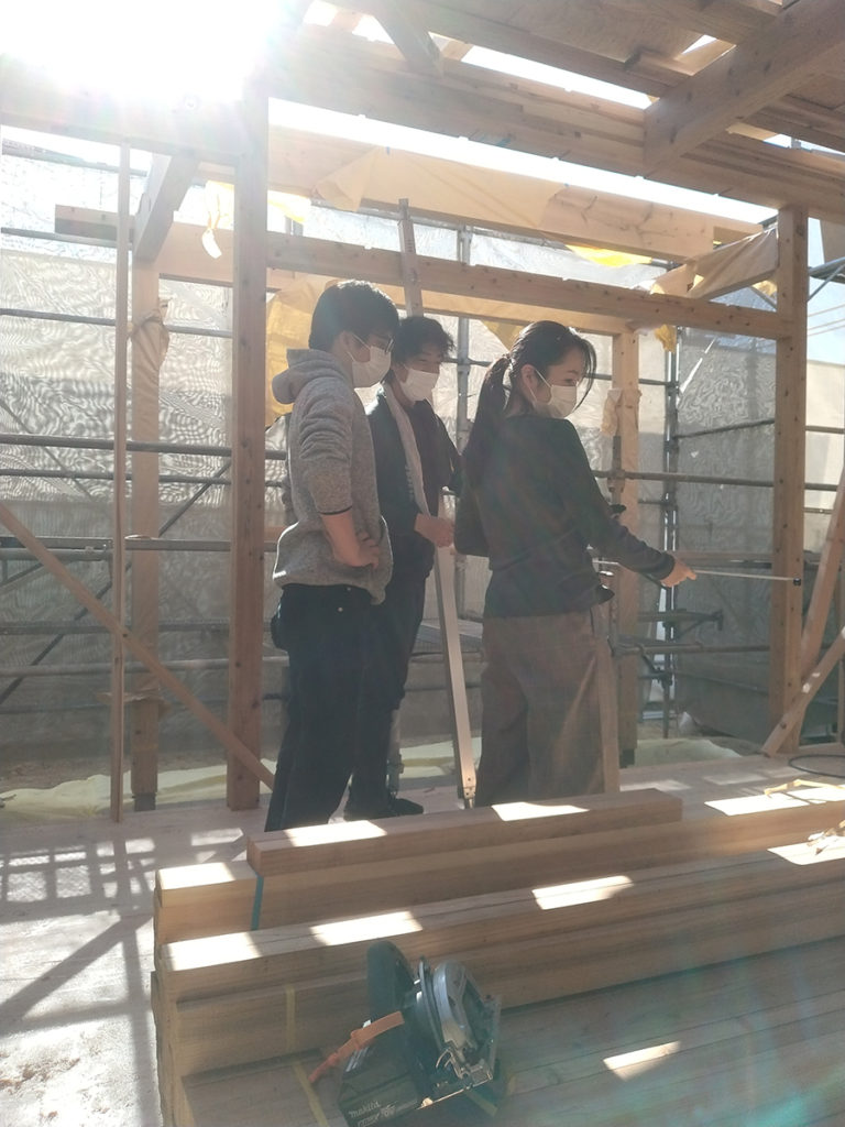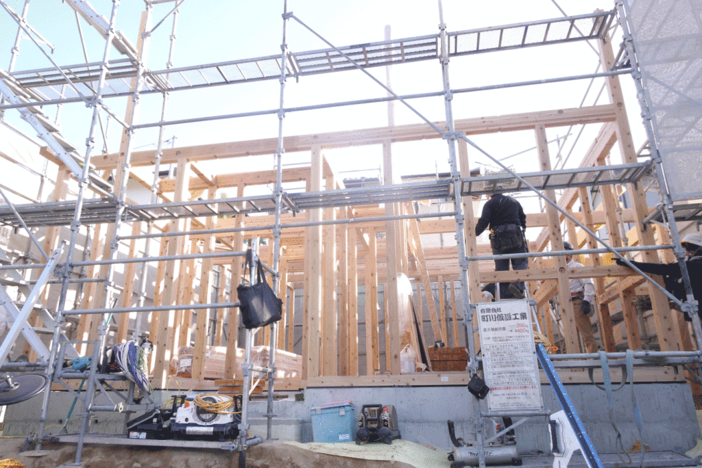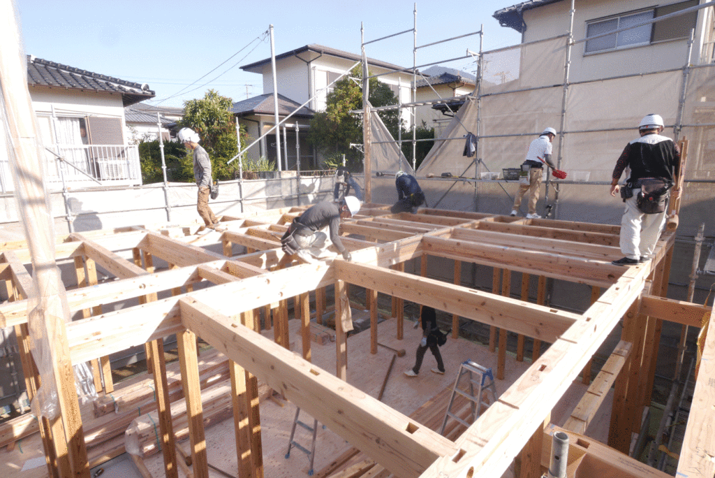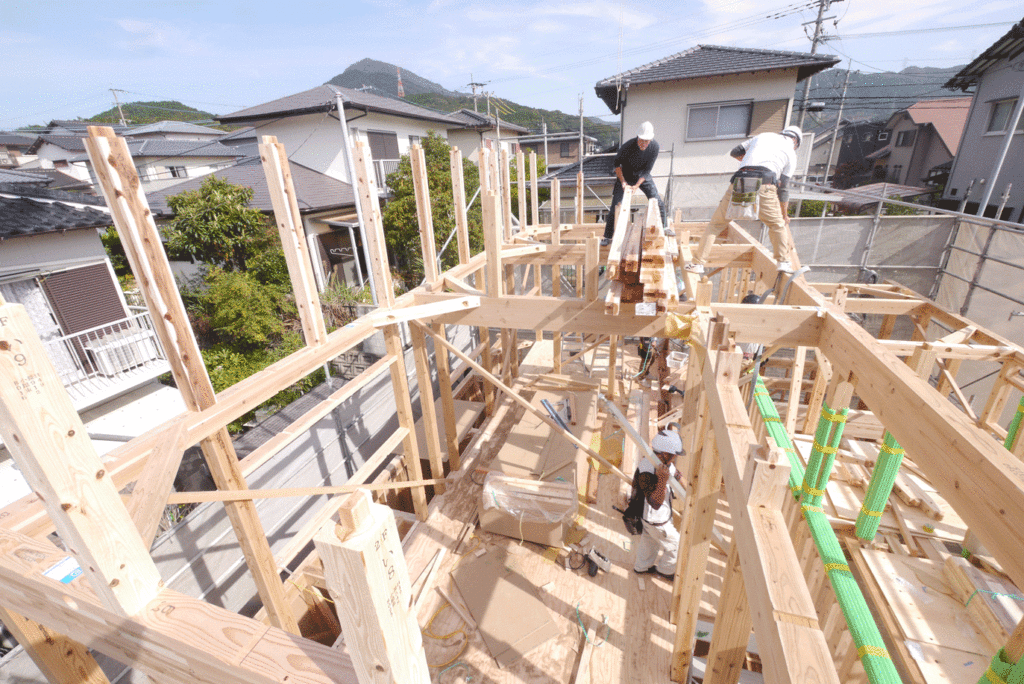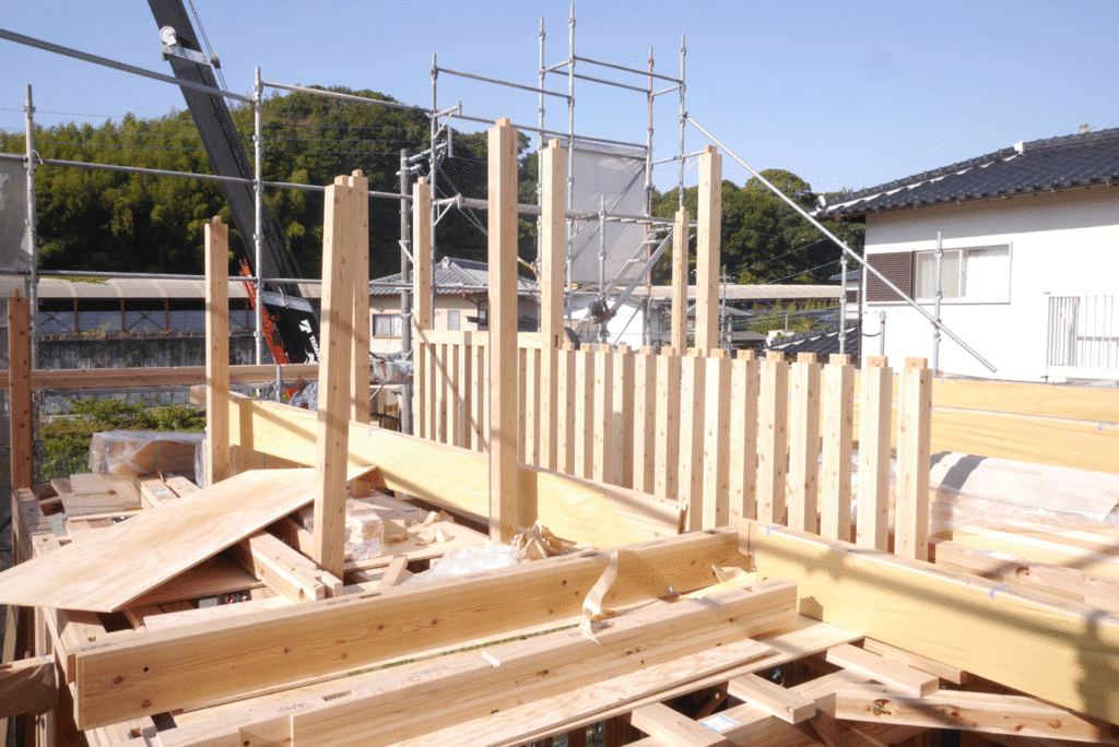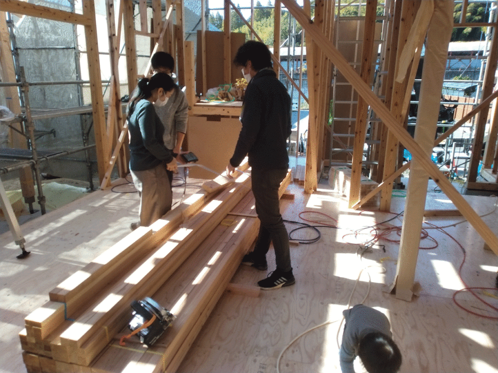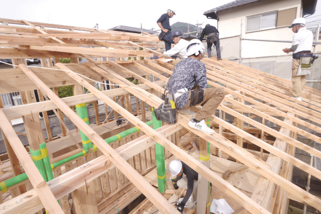 その後、2階の柱を立て、天井梁をかけたら、屋根の骨組みである小屋組みの作業になります!
