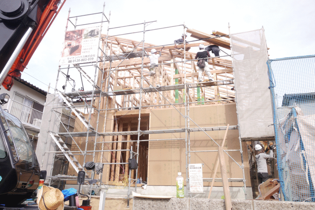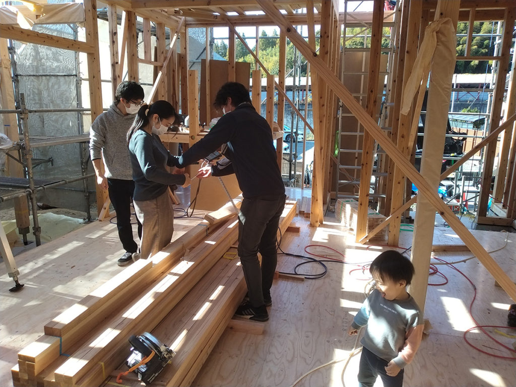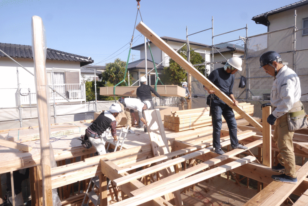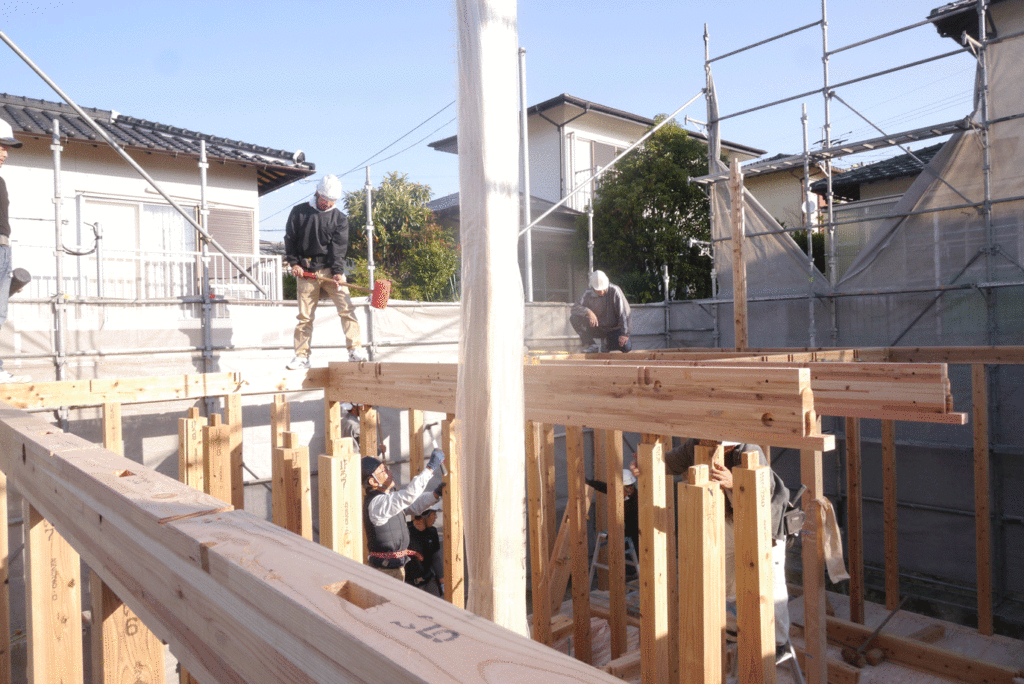 1階から屋根までを一気に組み上げていくので、棟上げの日はたくさんの大工さんの協力が必要になります!