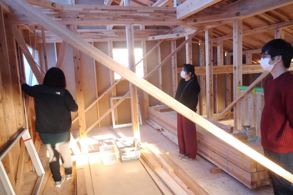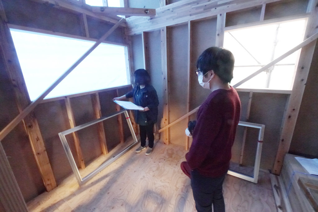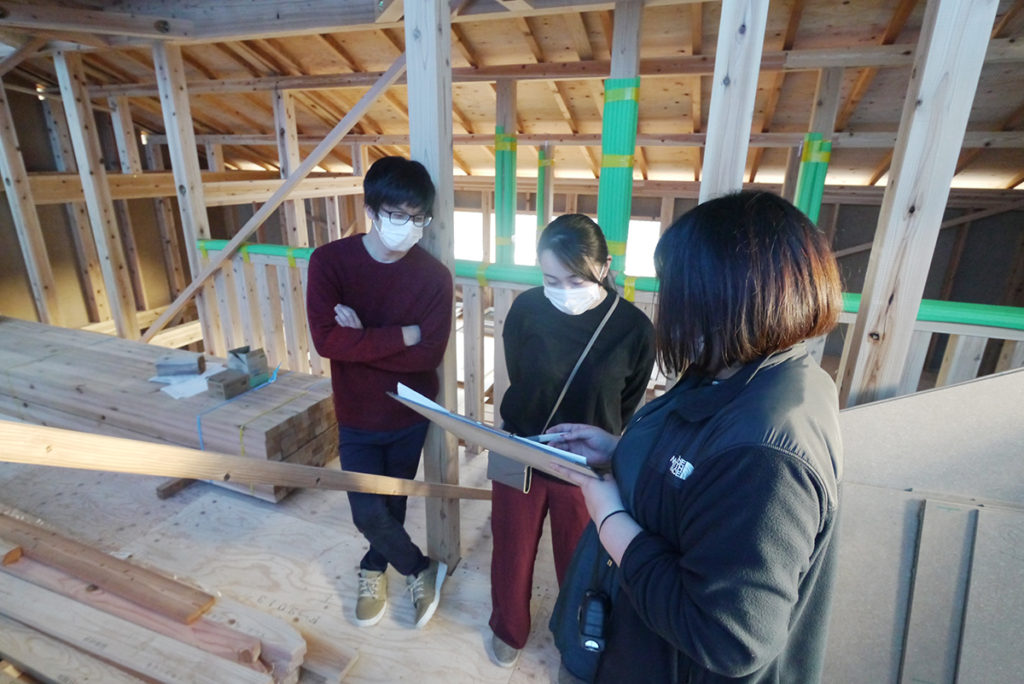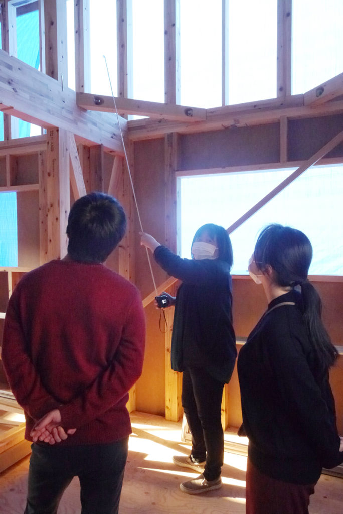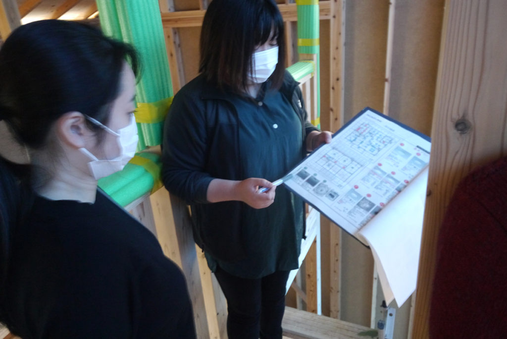 事務所で何度も打ち合わせをした内容を、実際に建ちあがった現場で図面と照らし合わせて確認していきます!