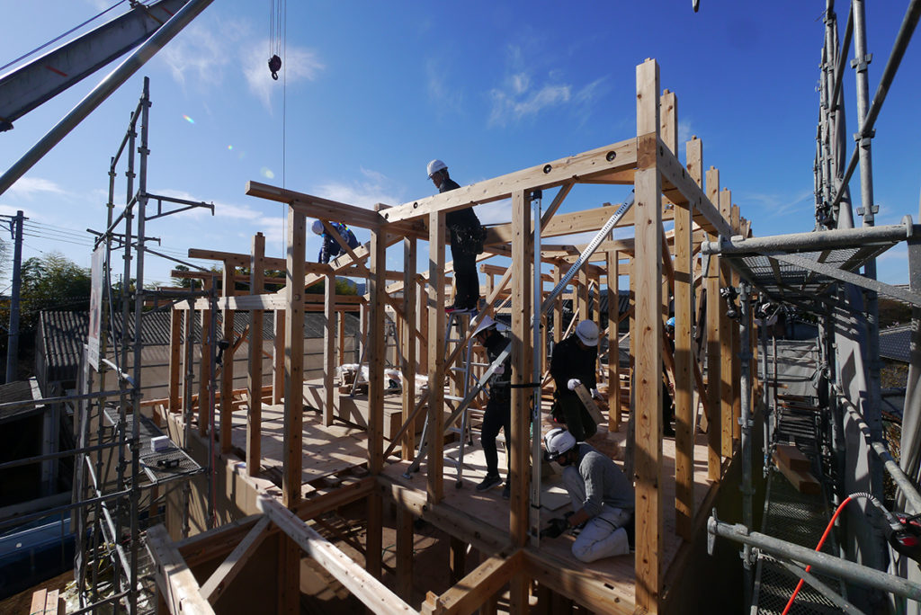 そして2階の床梁をかけていき、下から順に一日で組み上げていきます!