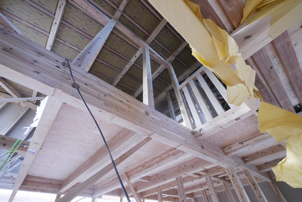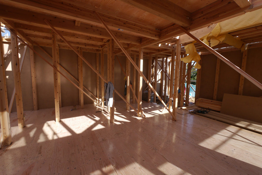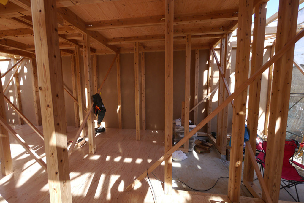 1階を覗いてみると、構造用面材が張り巡らされて、すっかりお家の中になりました!