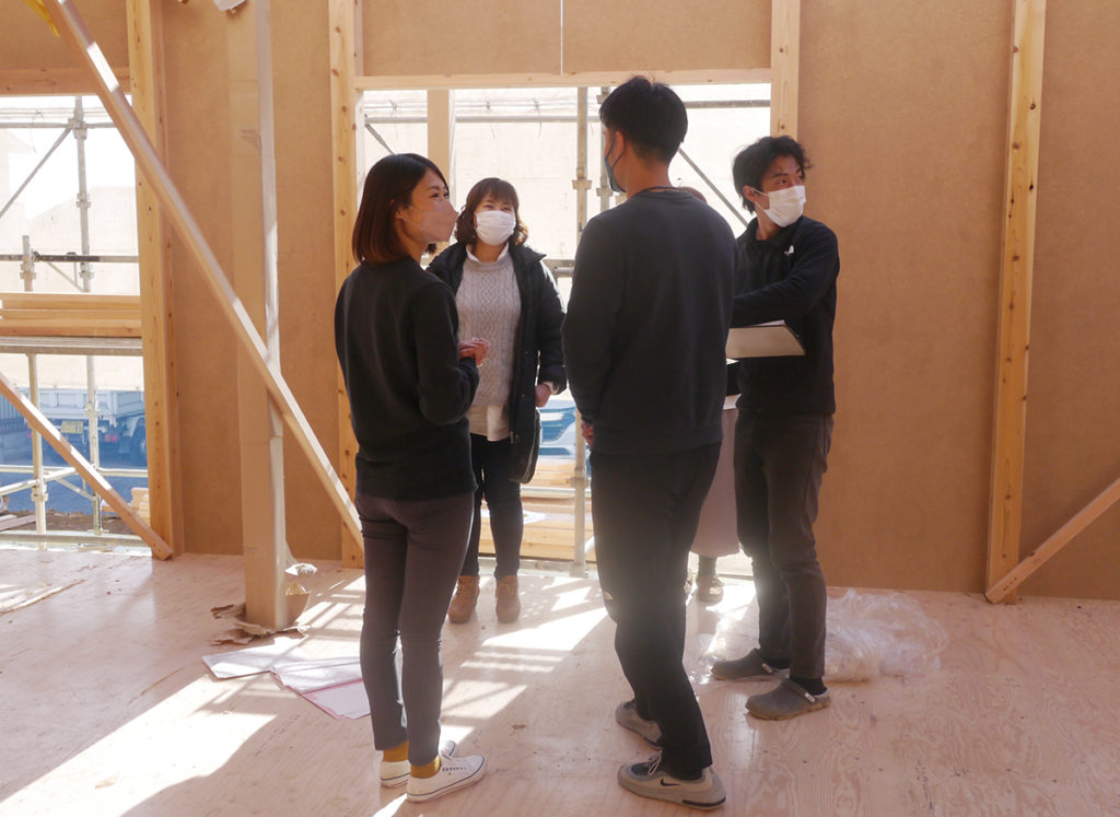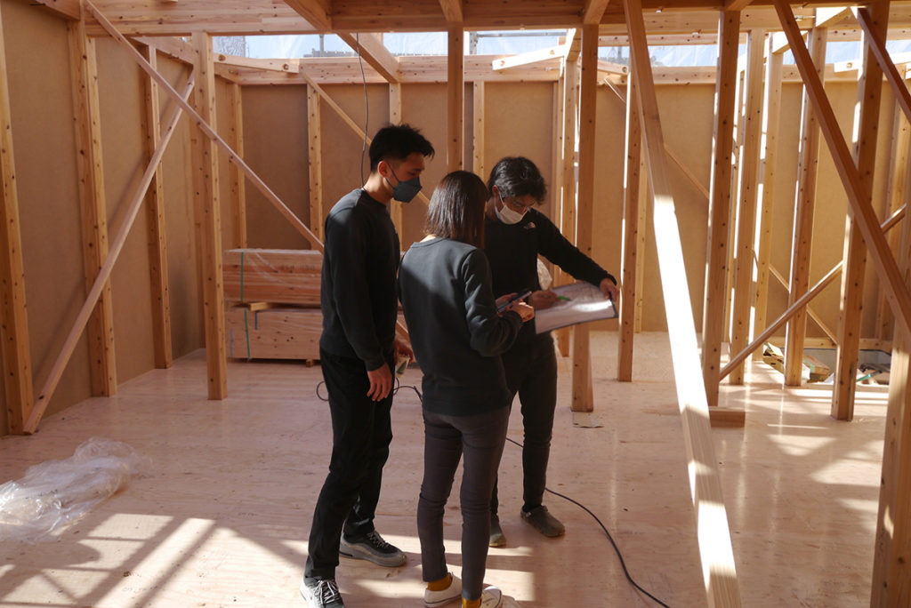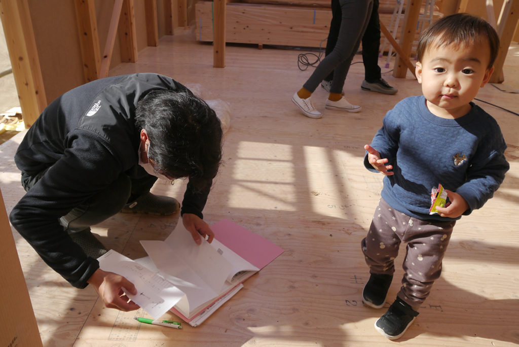 その間にI様は、建ち上がりつつある現場の中で、図面を見ながら間取りや配線などの確認作業を行なわれていました!