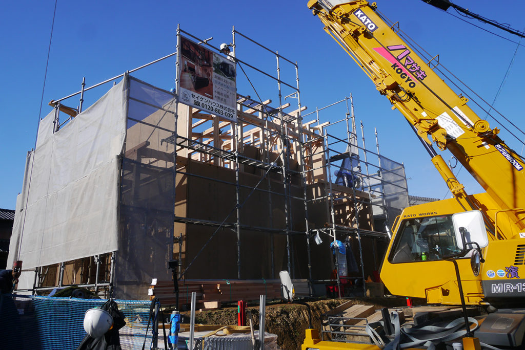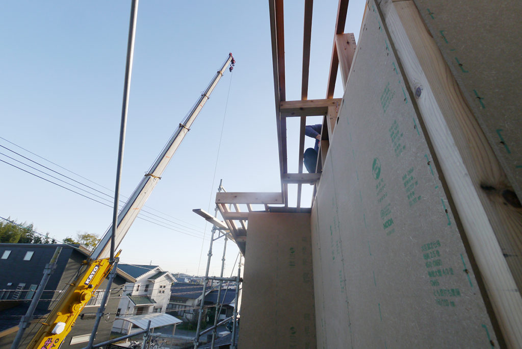 上棟日には、棟梁はじめ、応援の大工さん、クレーンの運転手さんなど、大勢で作業を進めていきます!