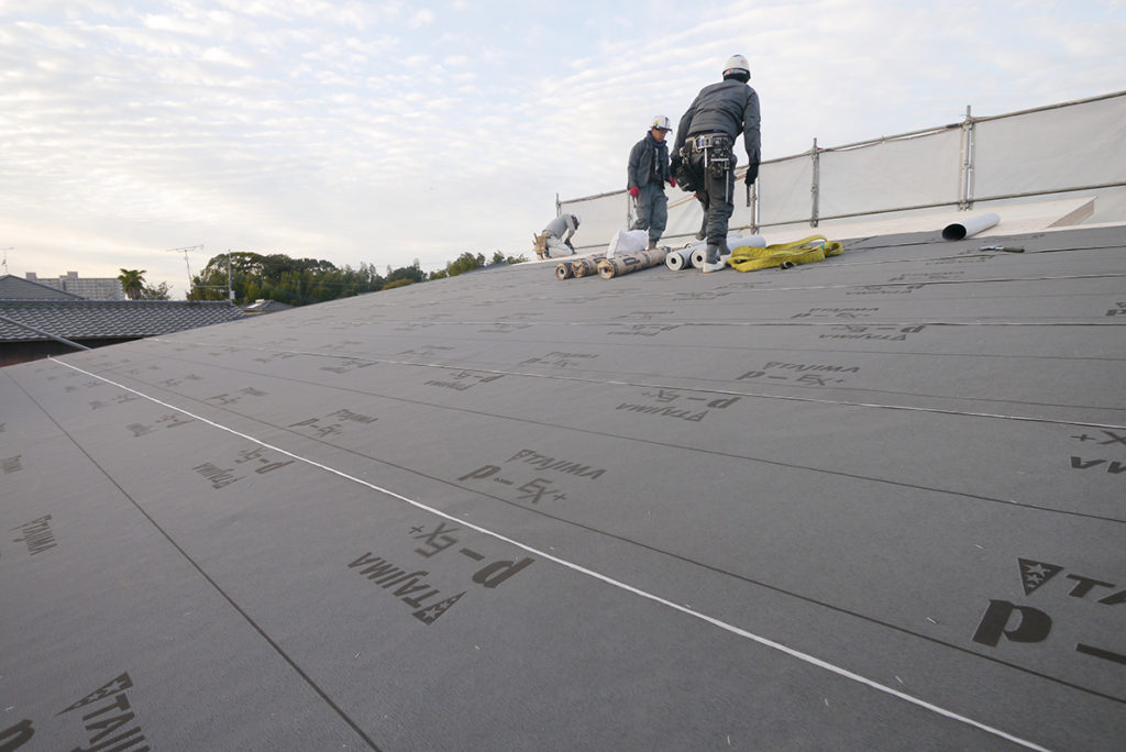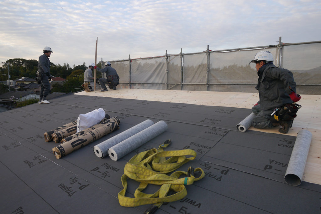 野地板を張り終わると、防水シートを敷いていきます!