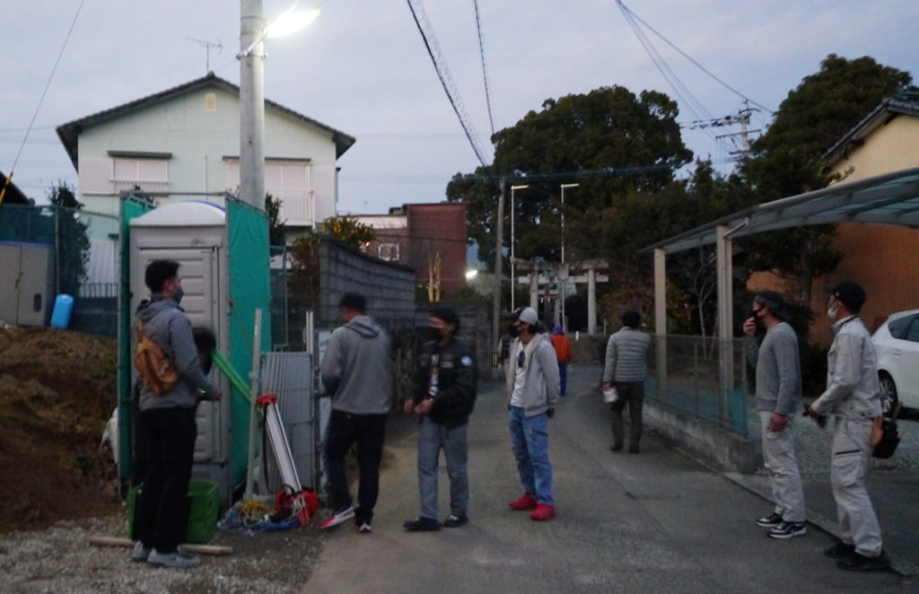 I様に差し入れていただいたお弁当で、大工さんたちは、ちょっと休憩中!