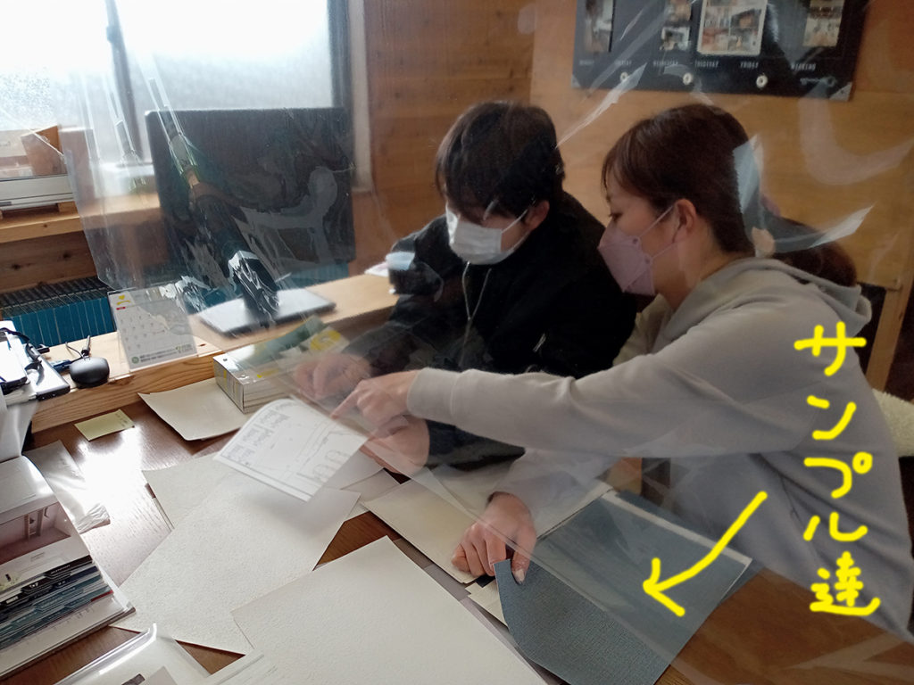 カタログやサンプルを見比べながら、壁全体に広がるクロスを想像して意見を交わしました(^^♪