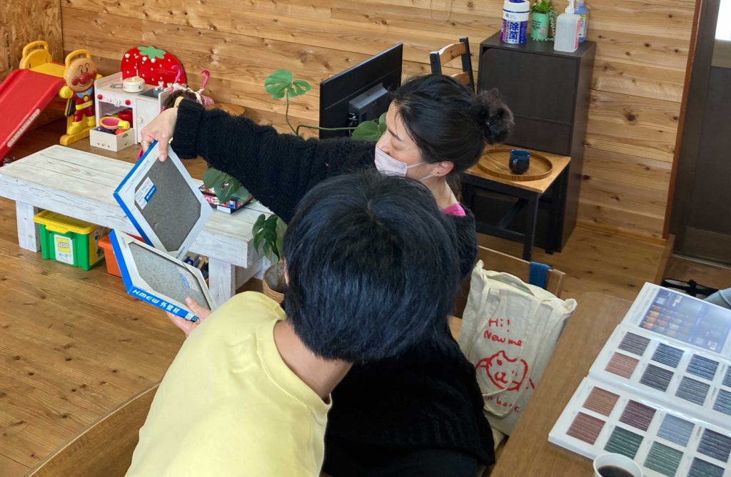 外壁の色は、ほぼ決まっているF様ですが、それに合わせた屋根の色を見比べて検討されています!